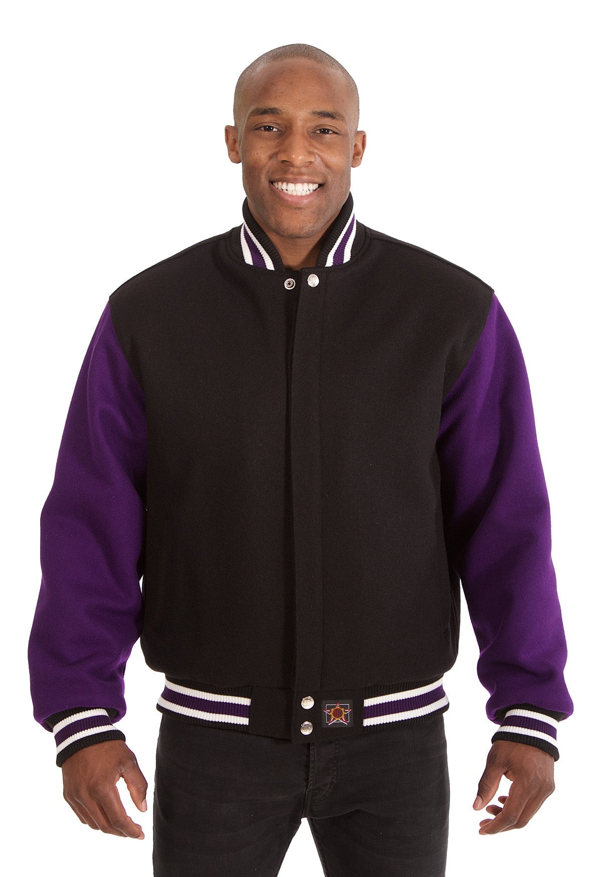 All-wool varsity jacket in black and purple with black and white ribbing.