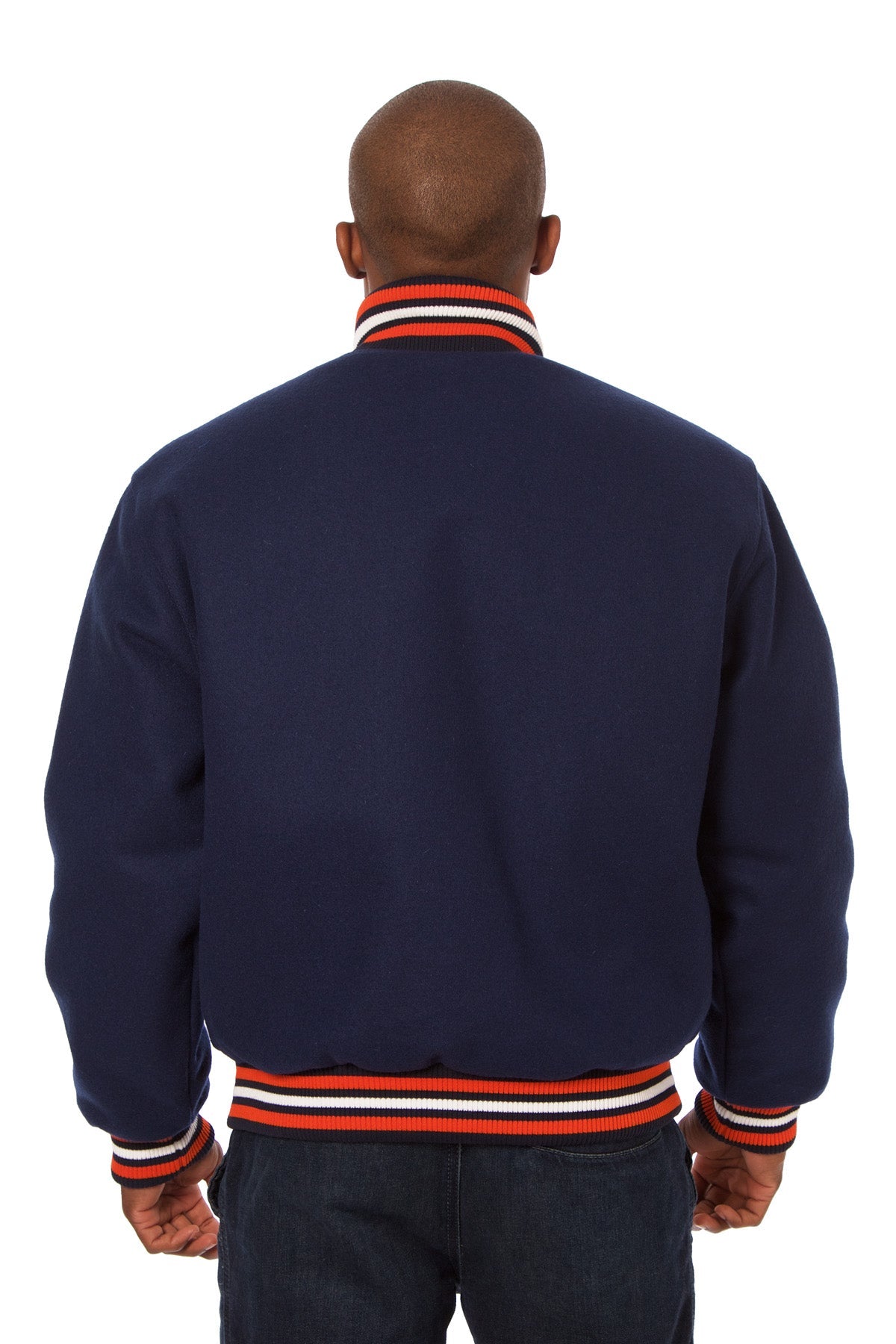 All-wool varsity jacket in navy with orange and white ribbing.