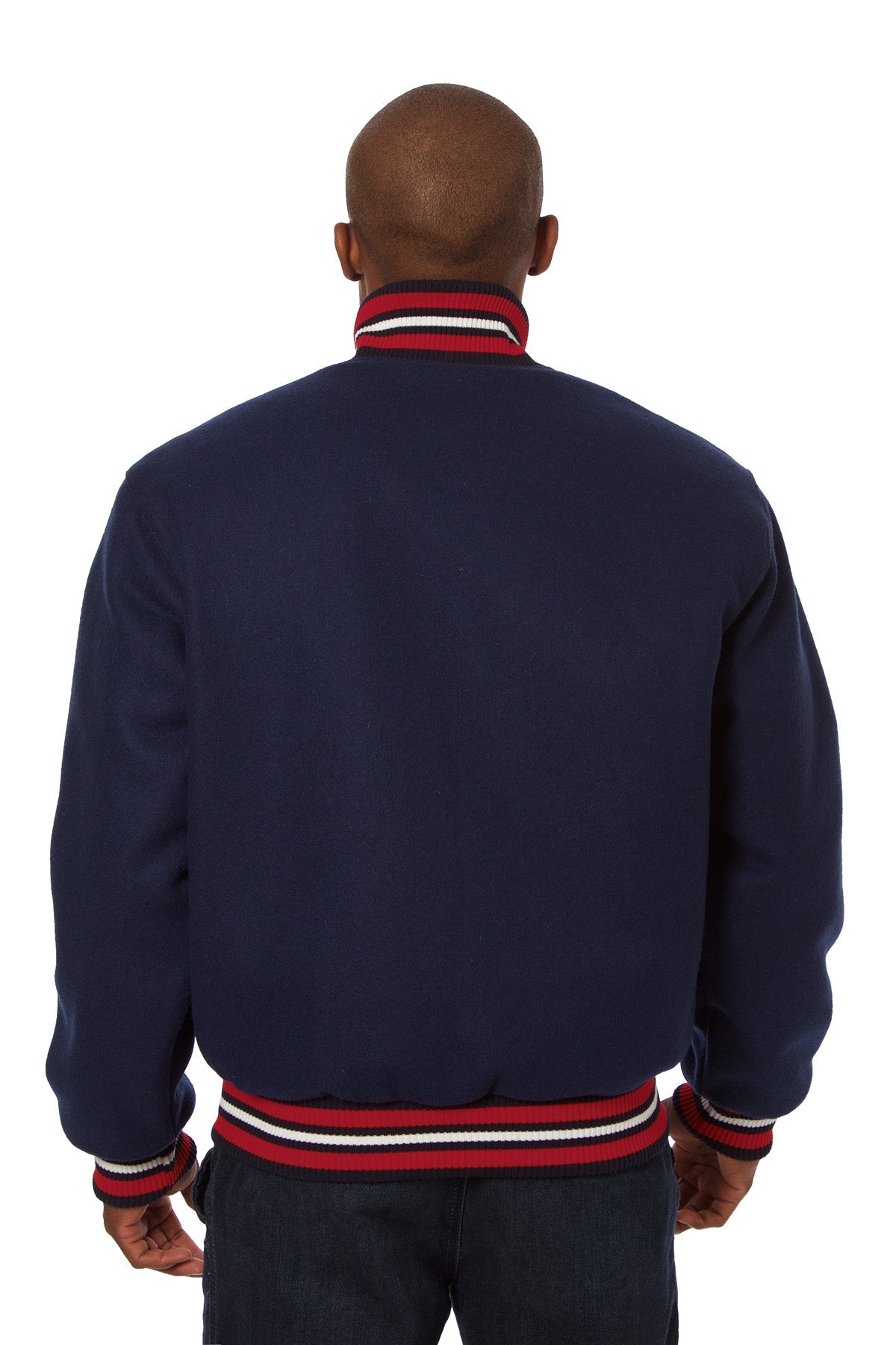 All-wool varsity jacket in navy with red and white ribbing.