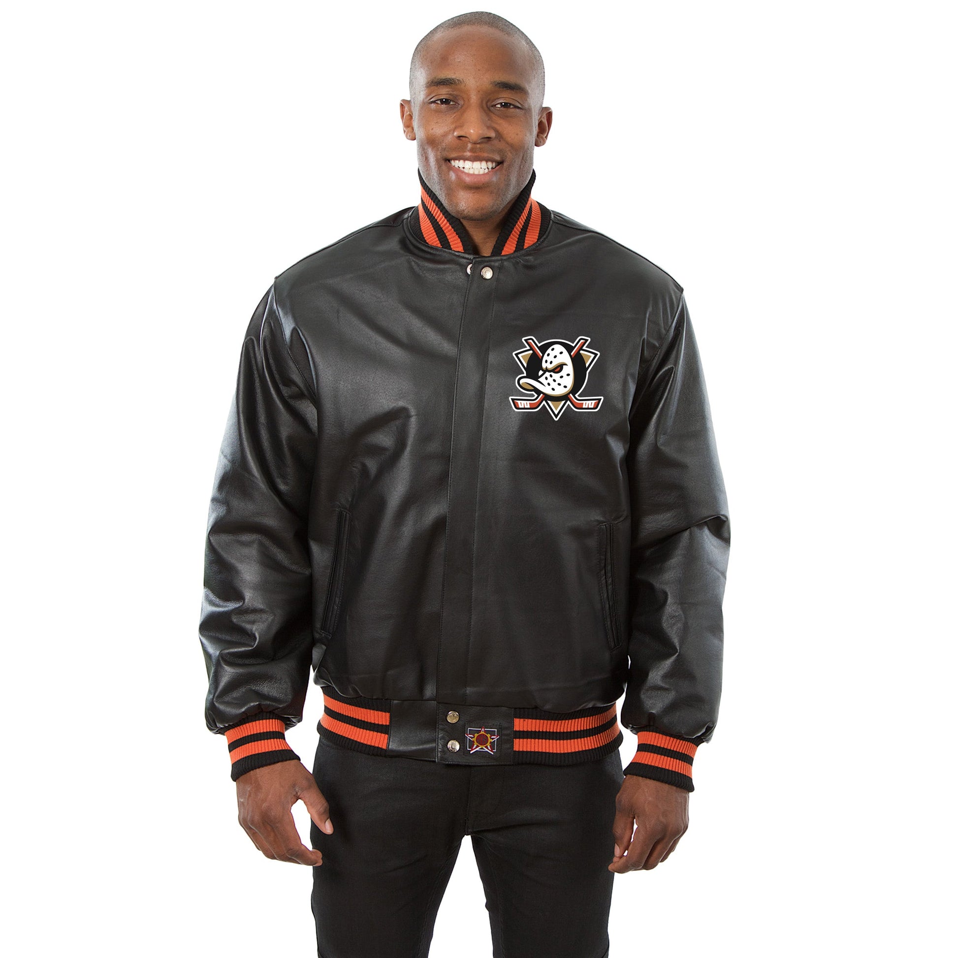 Anaheim Ducks full leather varsity jacket in black. Made in the USA. 100% leather body and sleeves with quilted nylon lining and leather logos, traditional snap front closure.