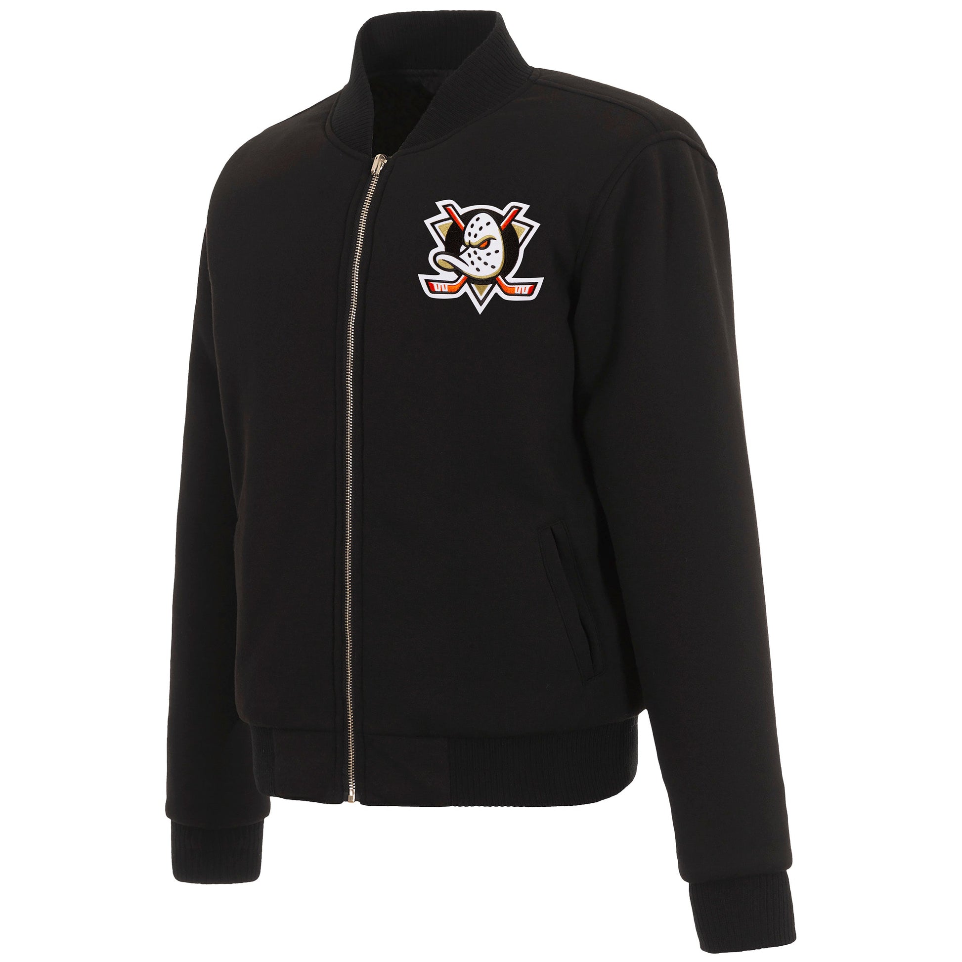 Anaheim Ducks Ladies reversible fleece jacket in black with embroidered logos. Assembled in the USA. 100% polyester body, reverse nylon side, metal zip closure.