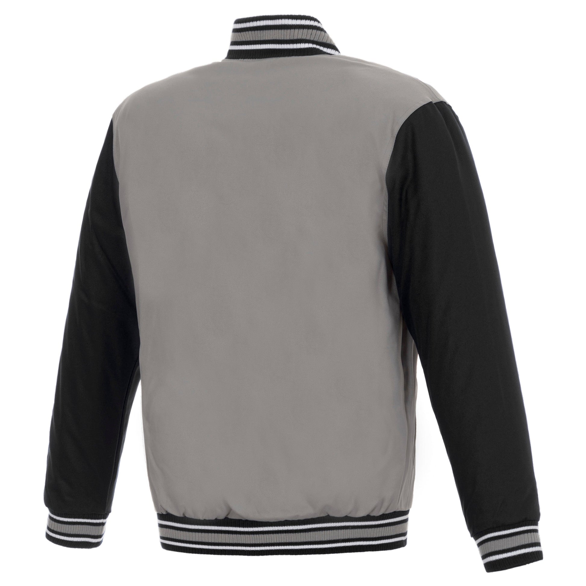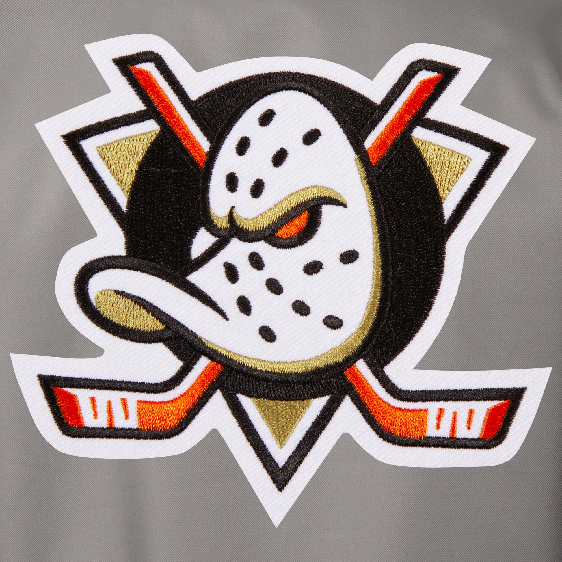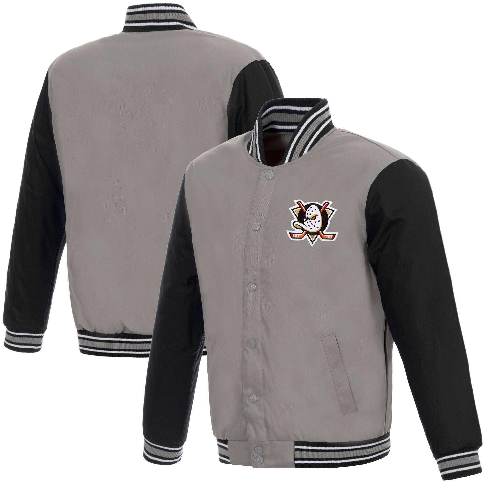 Anaheim Ducks Poly-Twill Jacket with quilted nylon lining in grey and black with embroidered logos. Assembled in the USA. 100% polyester body. Snap button closure.
