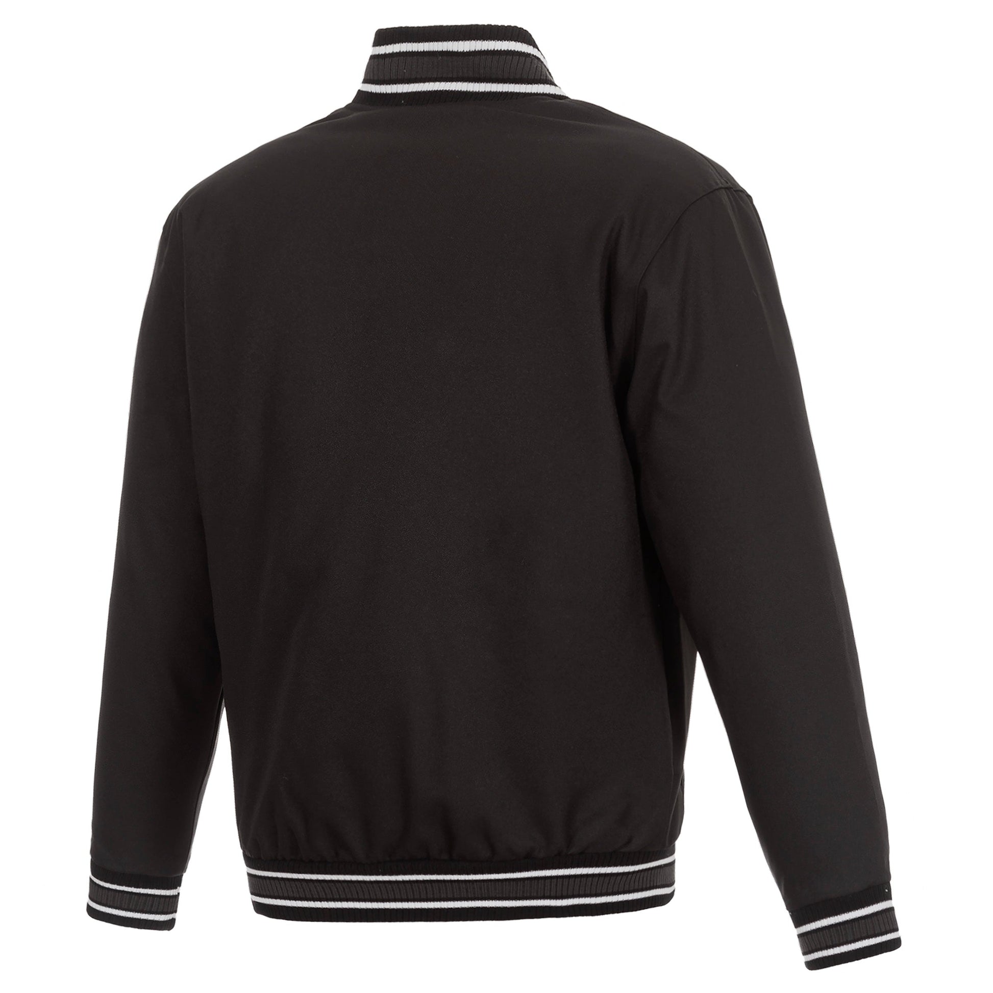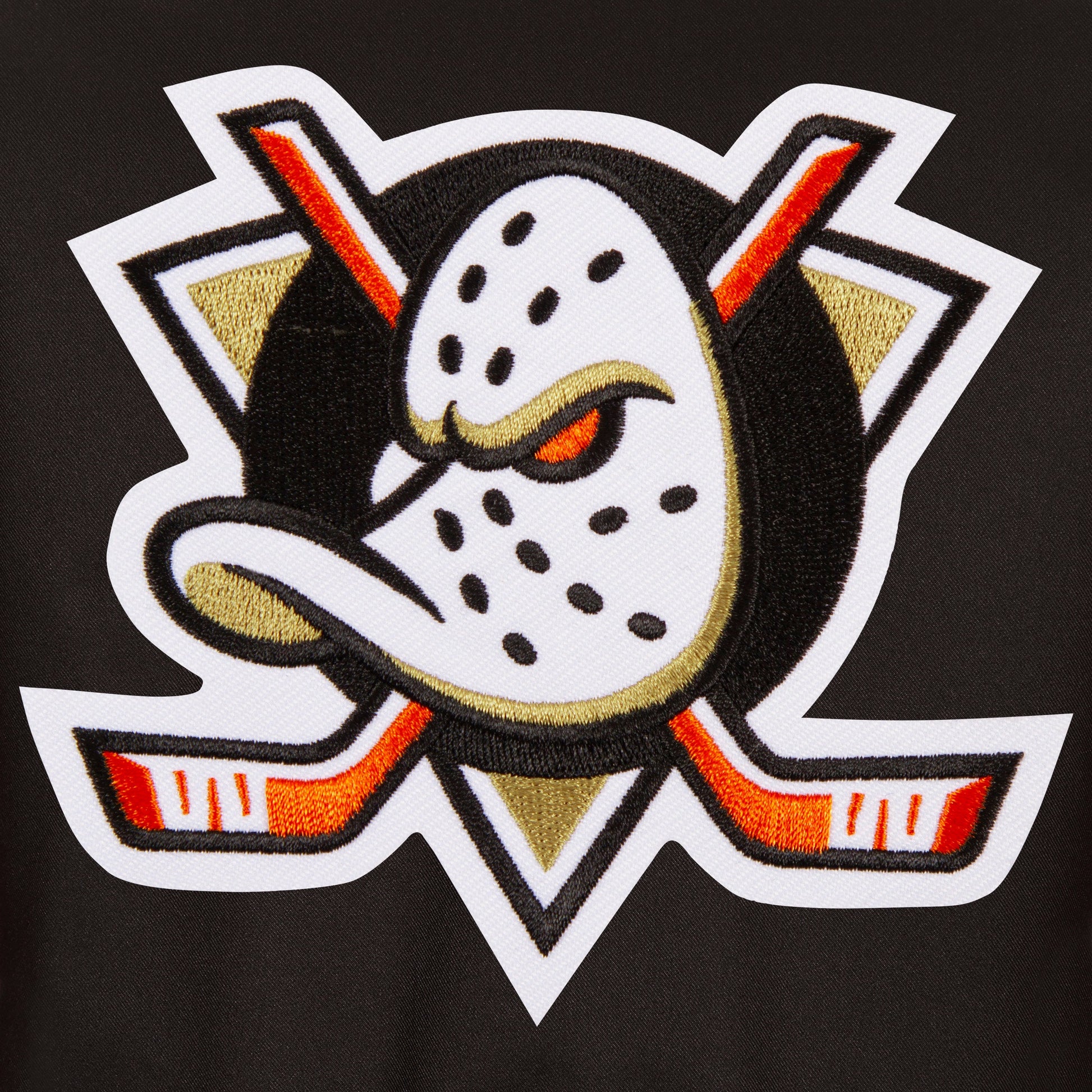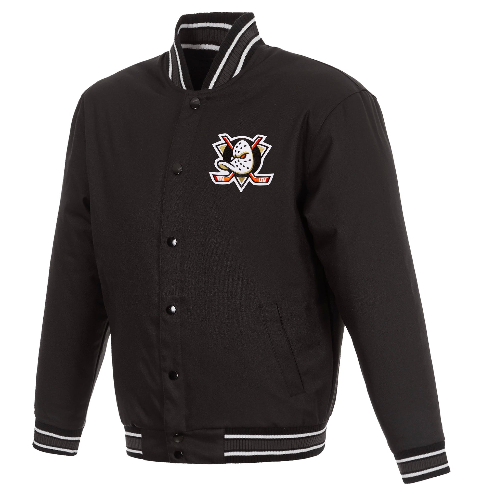 Anaheim Ducks Poly-Twill Jacket with quilted nylon lining in black with embroidered logos. Assembled in the USA. 100% polyester body. Snap button closure.
