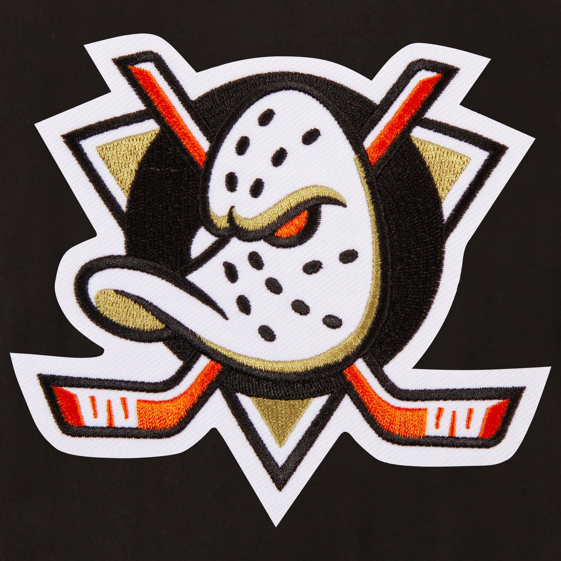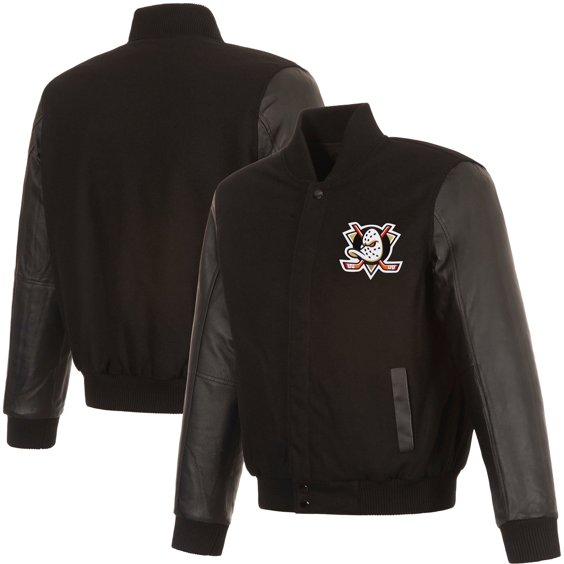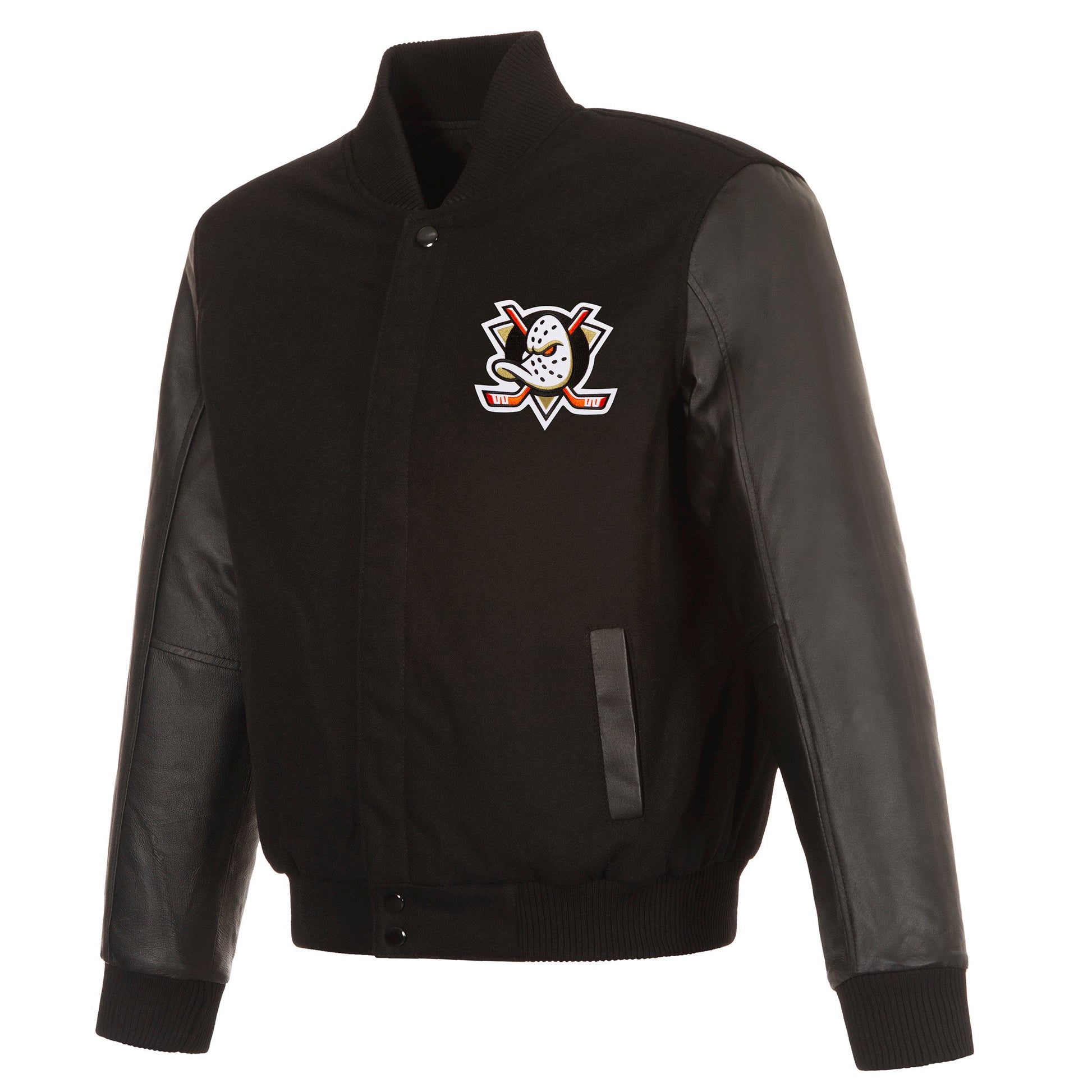 Anaheim Ducks Reversible Wool and Leather Jacket with quilted nylon lining in black with embroidered logos. Assembled in the USA. 55% Wool 45% polyester body, 100% leather sleeves. Snap button closure.
