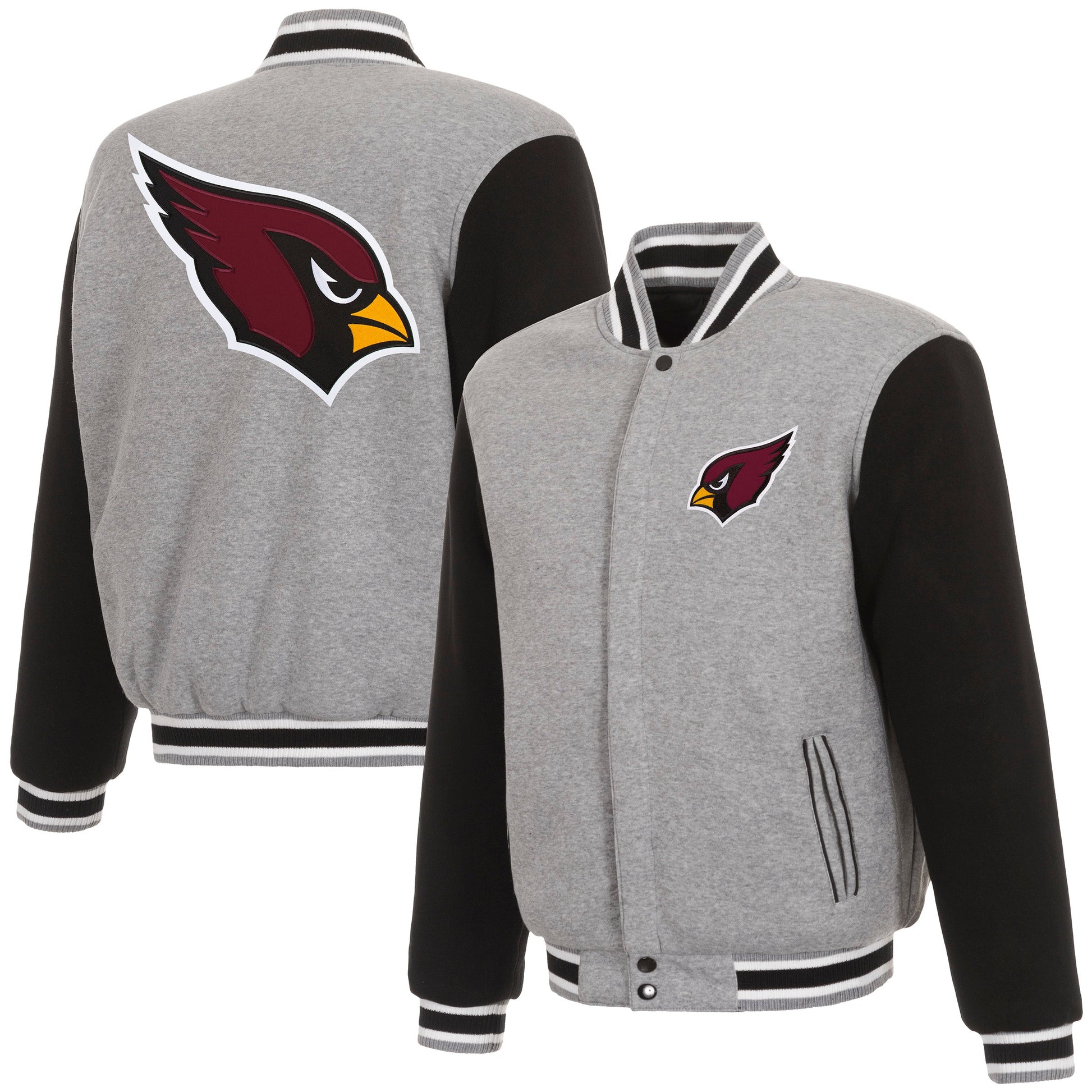 Arizona Cardinals revesible two-tone fleece jacket in grey and black with embroidered logos. Assembled in the USA. 100% polyester body, reverse nylon side, snap button closure.