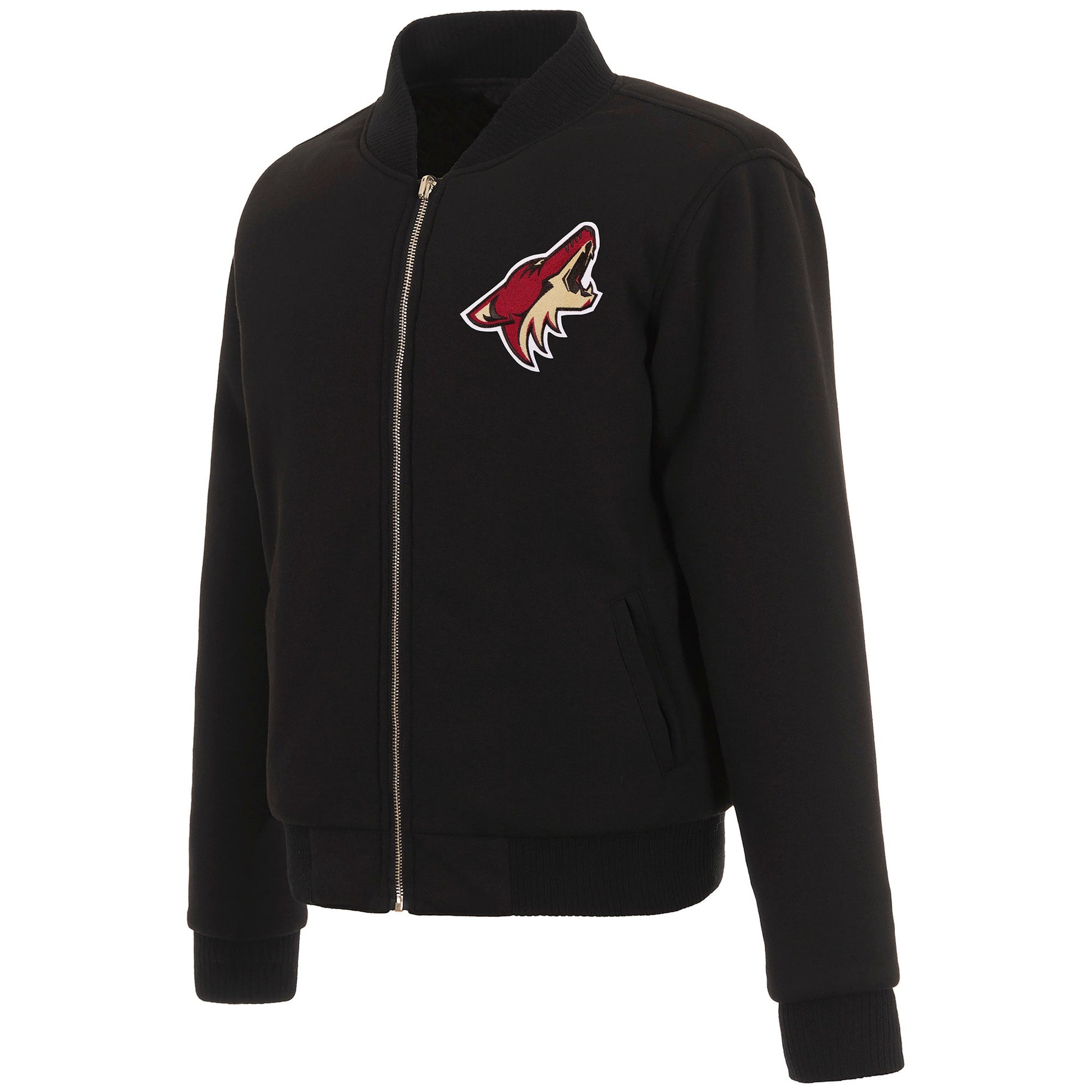 Arizona Coyotes Ladies reversible fleece jacket in black with embroidered logos. Assembled in the USA. 100% polyester body, reverse nylon side, metal zip closure.