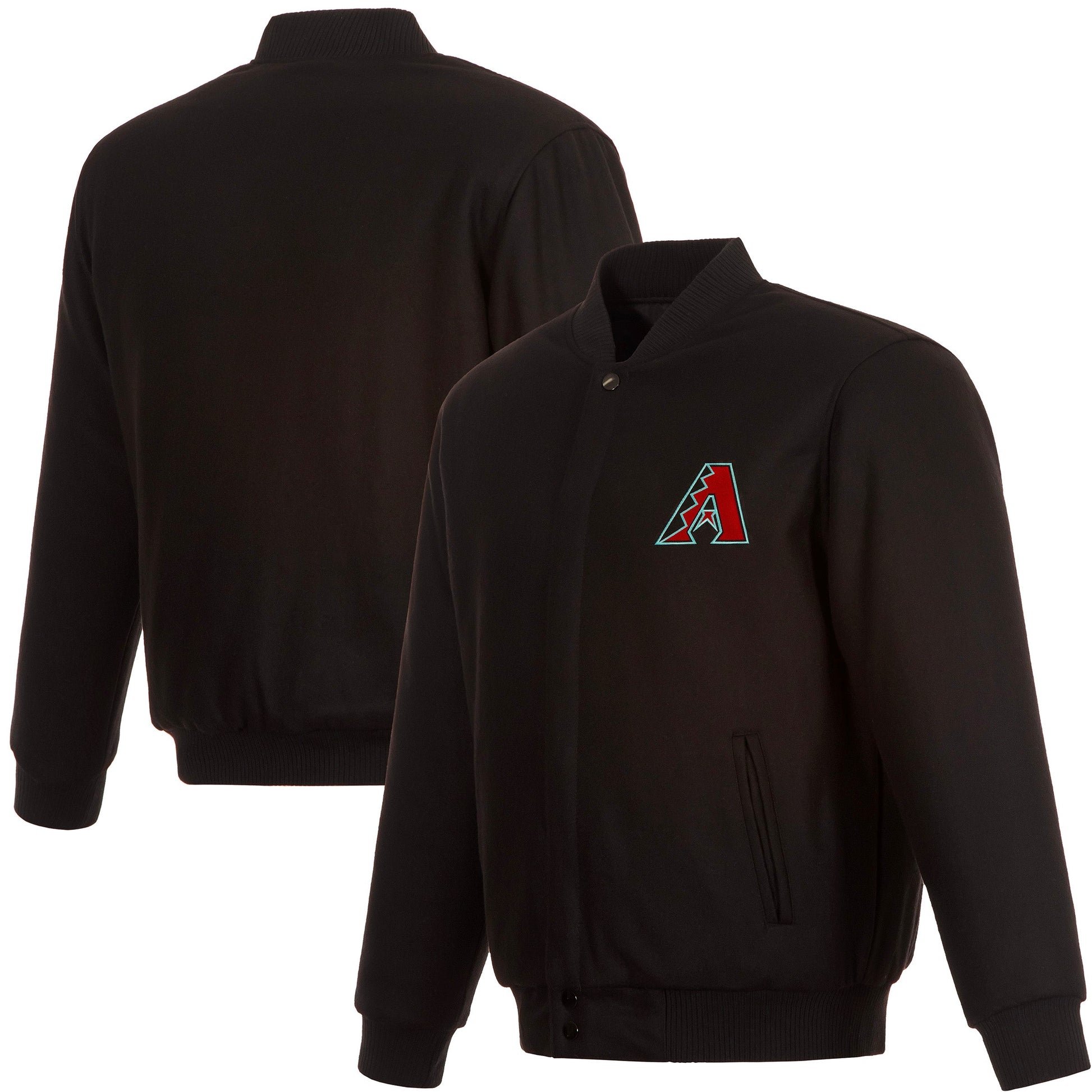 Arizona Diamondbacks All Wool Jacket with nylon lining in black with embroidered logos. Assembled in the USA. 55% wool 45% polyester body. Snap button closure.