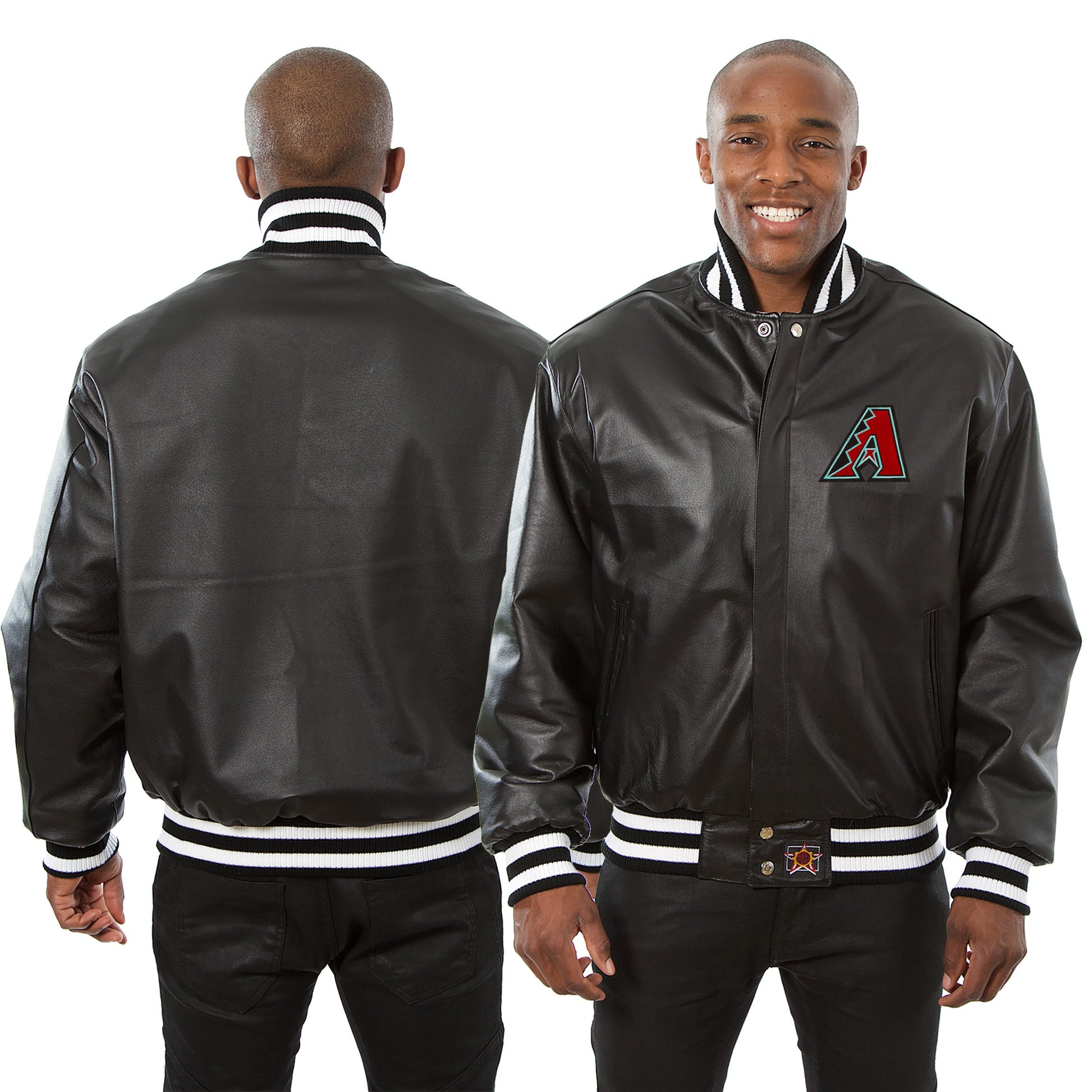 Arizona Diamondbacks full leather varsity jacket in black. Made in the USA. 100% leather body and sleeves with quilted nylon lining and leather logos, traditional snap front closure.
