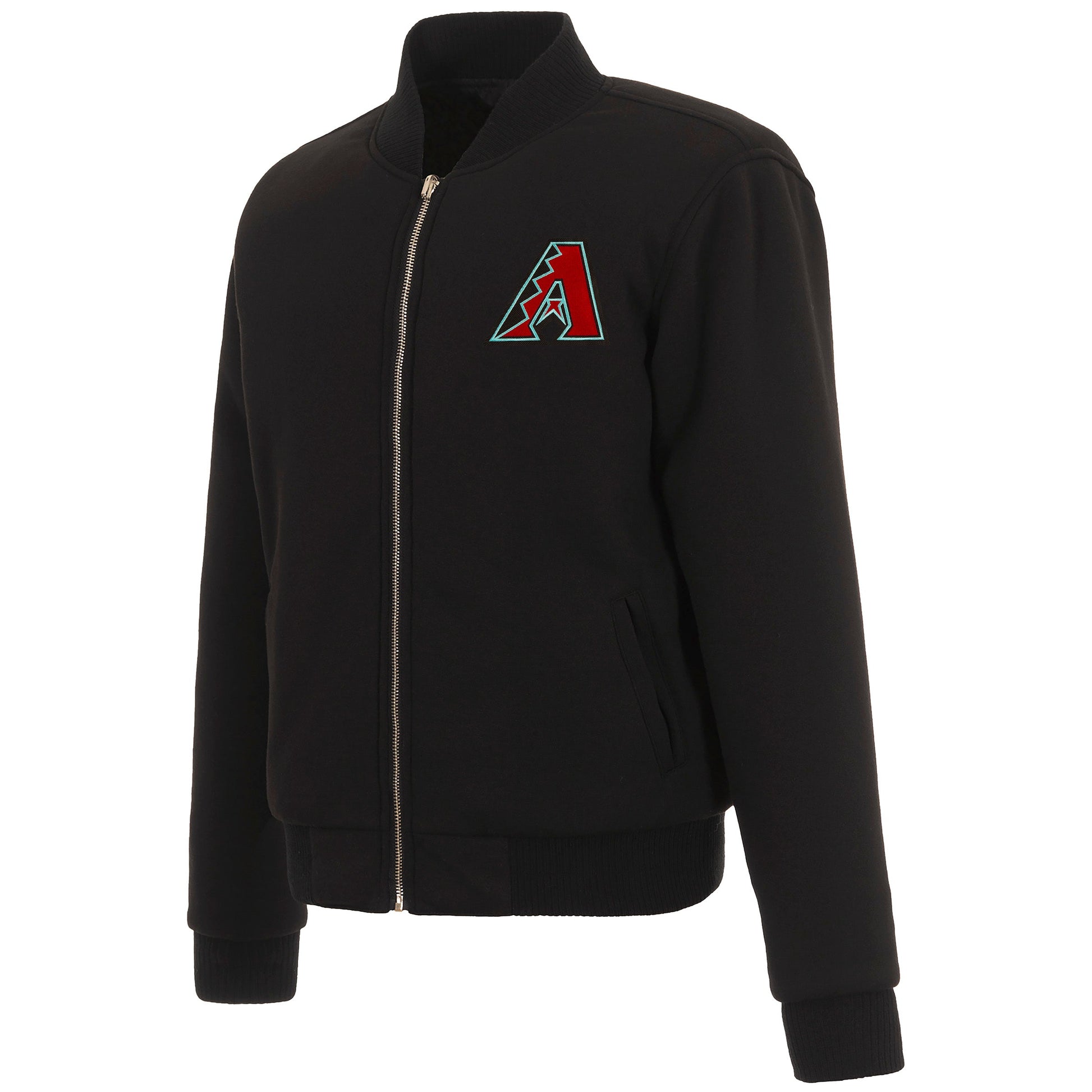 Arizona Diamondbacks Ladies reversible fleece jacket in black with embroidered logos. Assembled in the USA. 100% polyester body, reverse nylon side, metal zip closure.