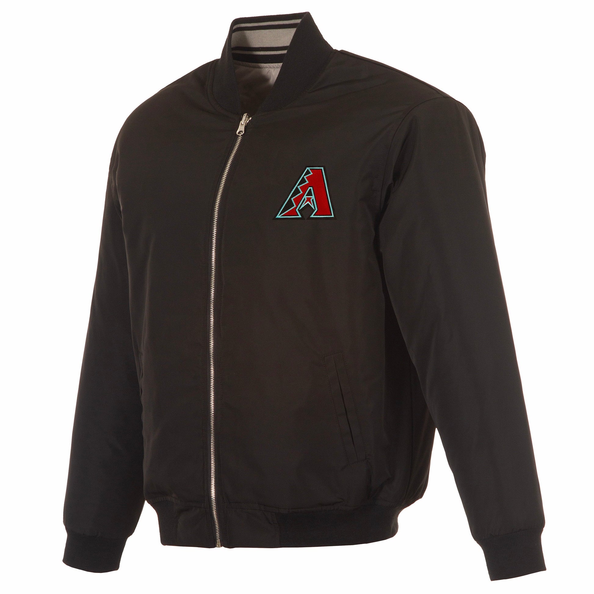 Arizona Diamonbacks reversible nylon bomber in black and grey with embroidered logos. Assembled in the USA. 100% Nylon, full length zip front.