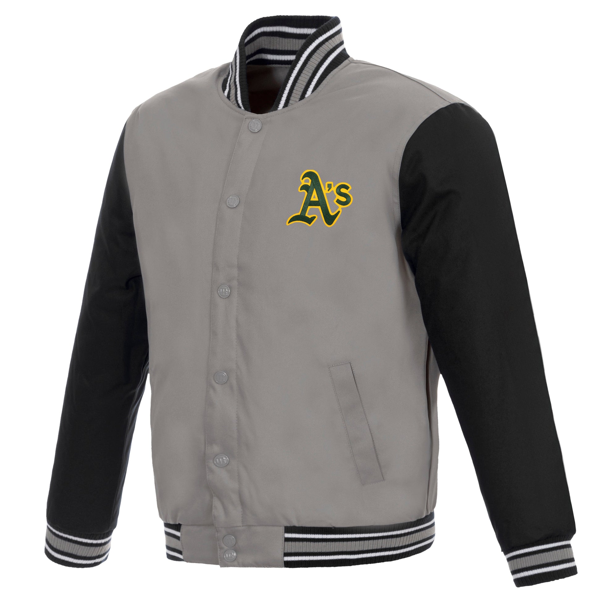 Athletics poly-twill jacket in gray and black with quilted nylon lining and embroidered appliqué logos.