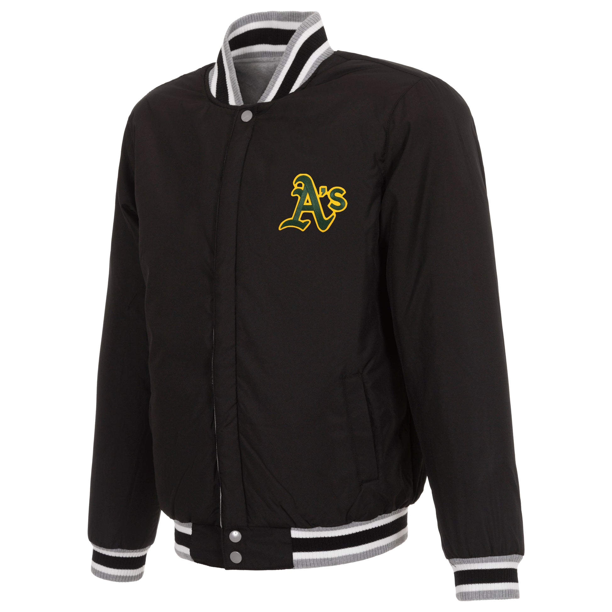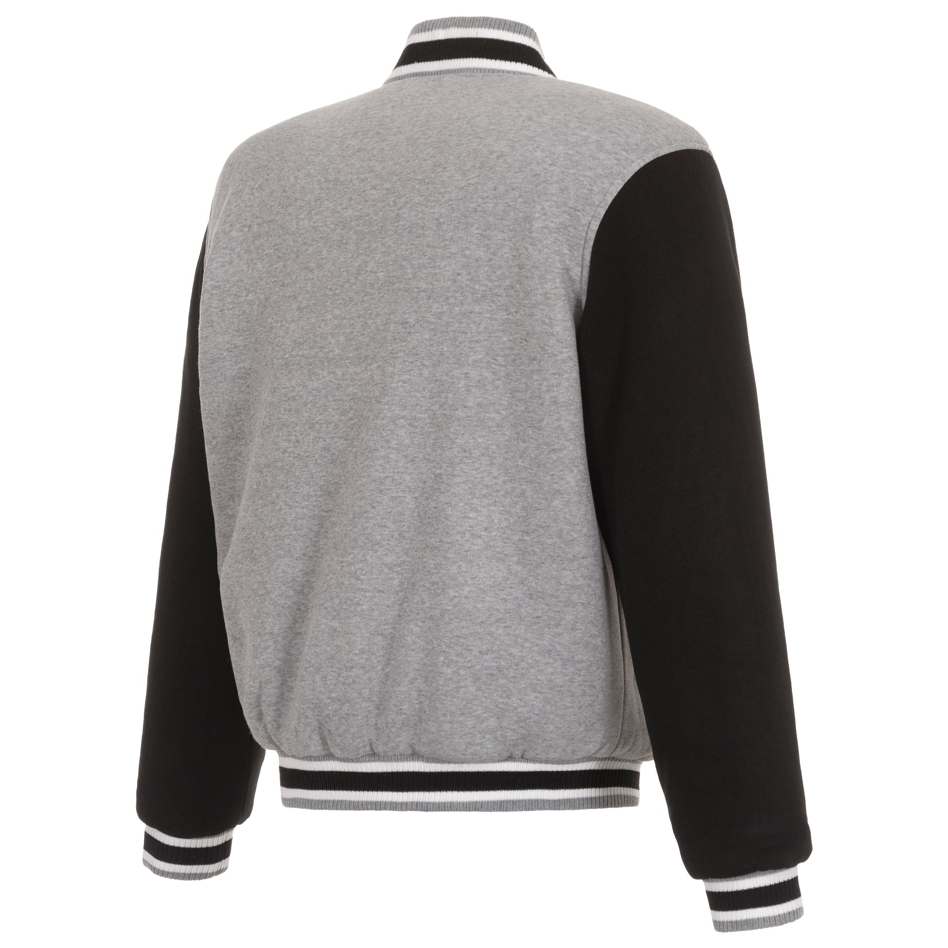 Athletics reversible two-tone fleece jacket in gray and black with nylon lining and embroidered logos.