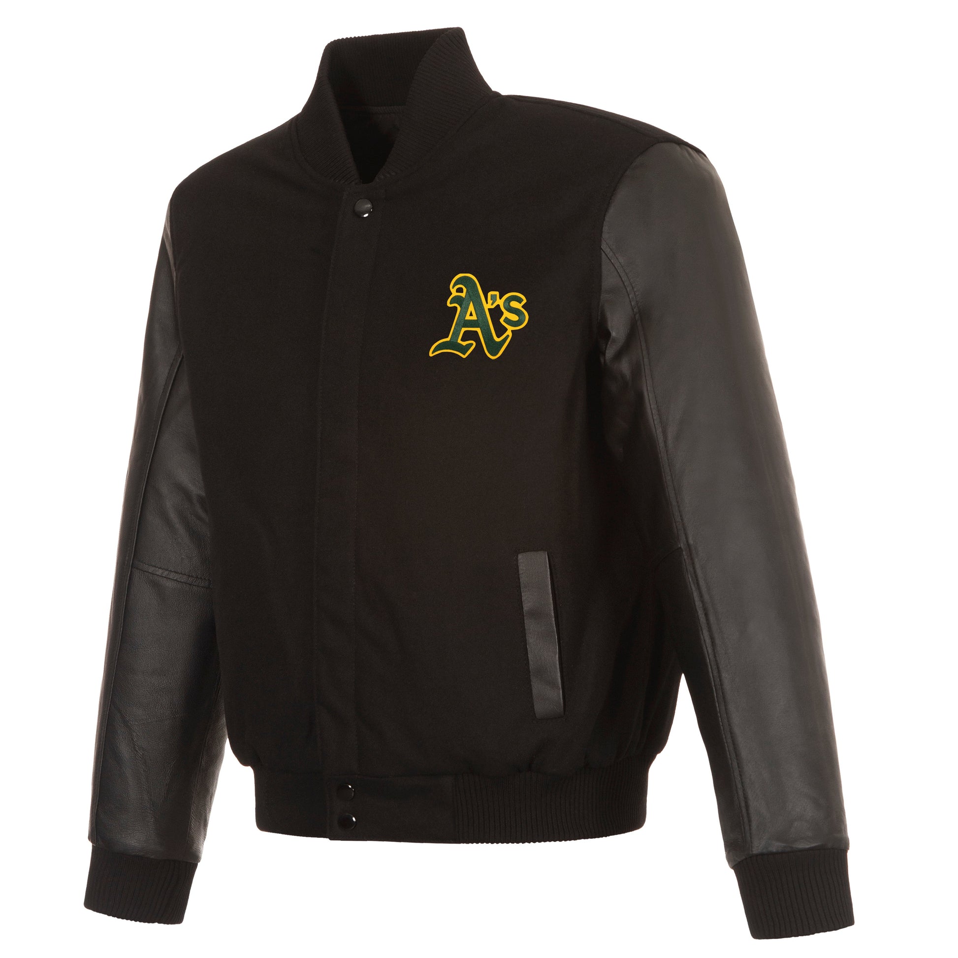 Athletics reversible wool body and leather sleeves jacket in black with quilted lining and embroidered appliqué logos.
