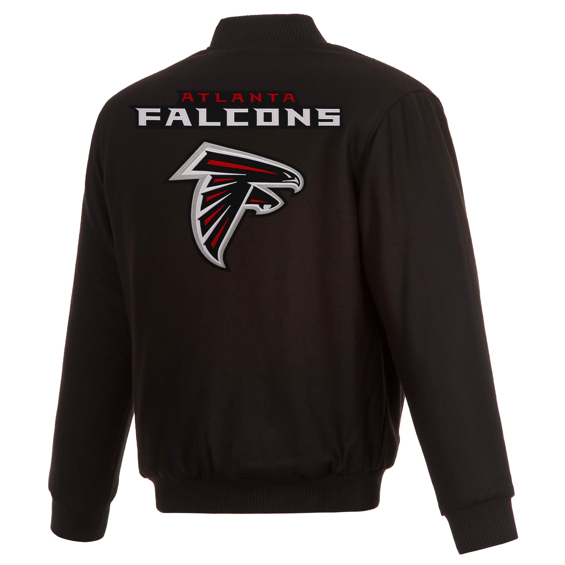 Atlanta Falcons All Wool Jacket with nylon lining in black with embroidered logos. Assembled in the USA. 55% wool 45% polyester body. Snap button closure.