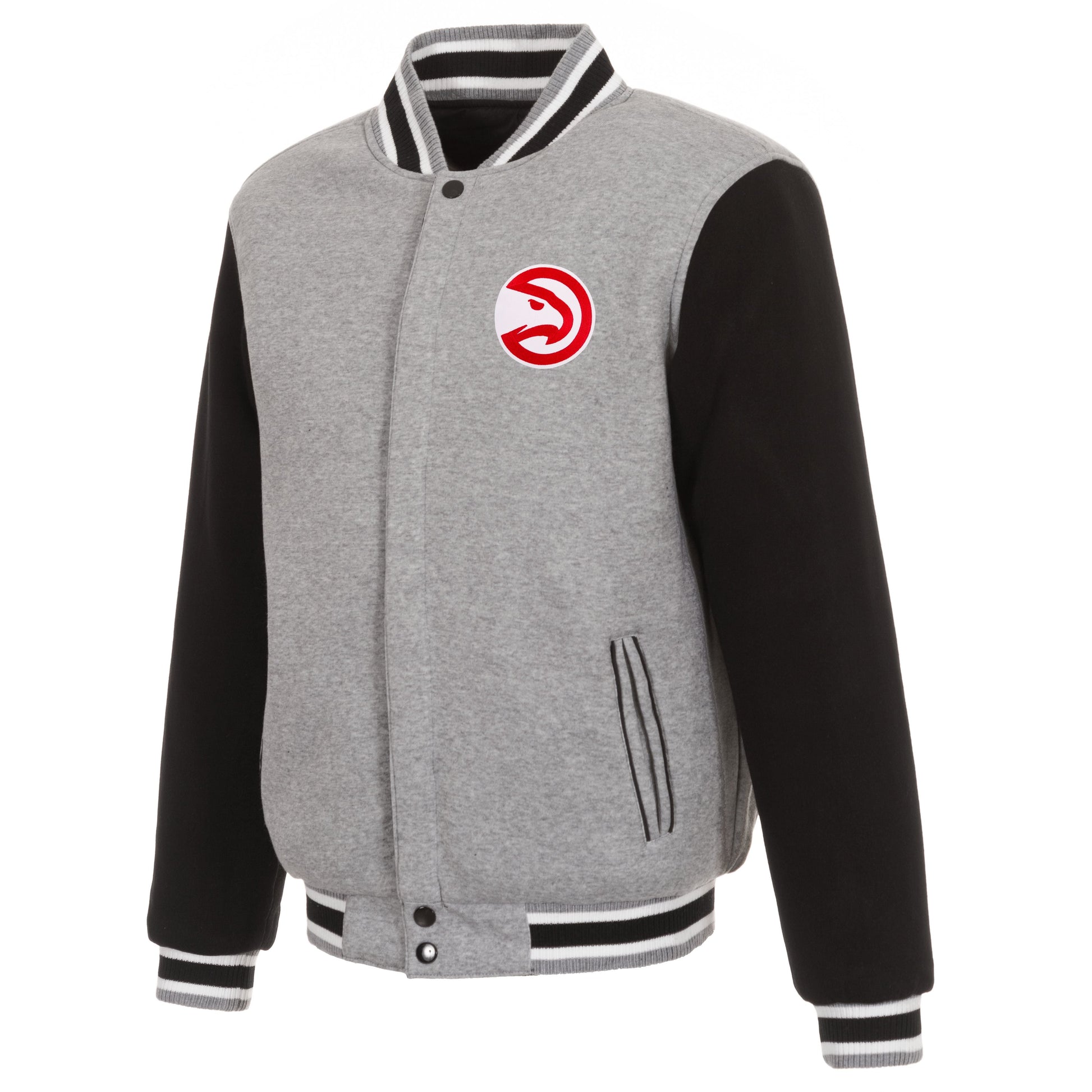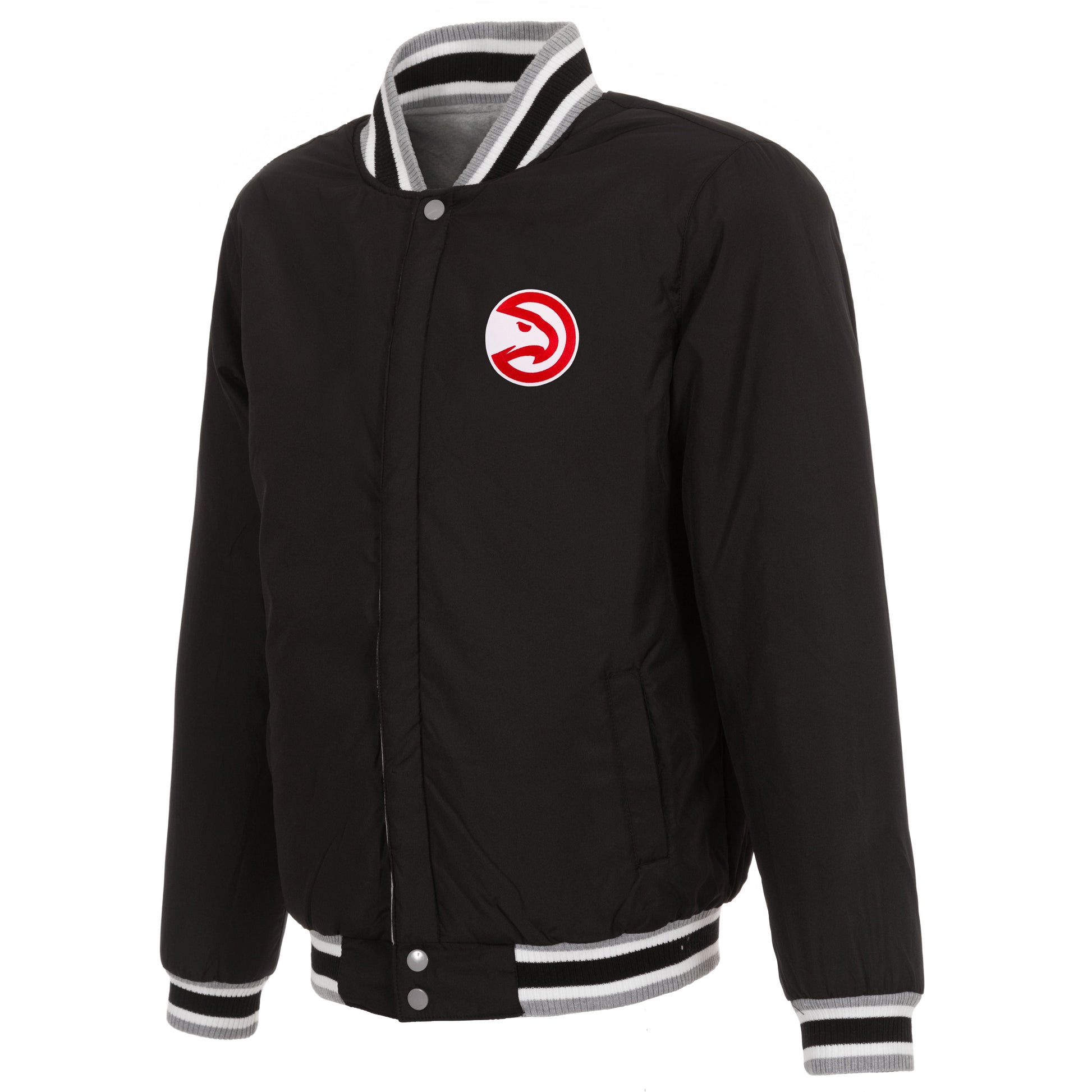 Atlanta Hawks Reversible Two-Tone fleece jacket in grey and black with embroidered logos. Assembled in the USA. 100% Polyester body, reverse nylon side, snap button closure.
