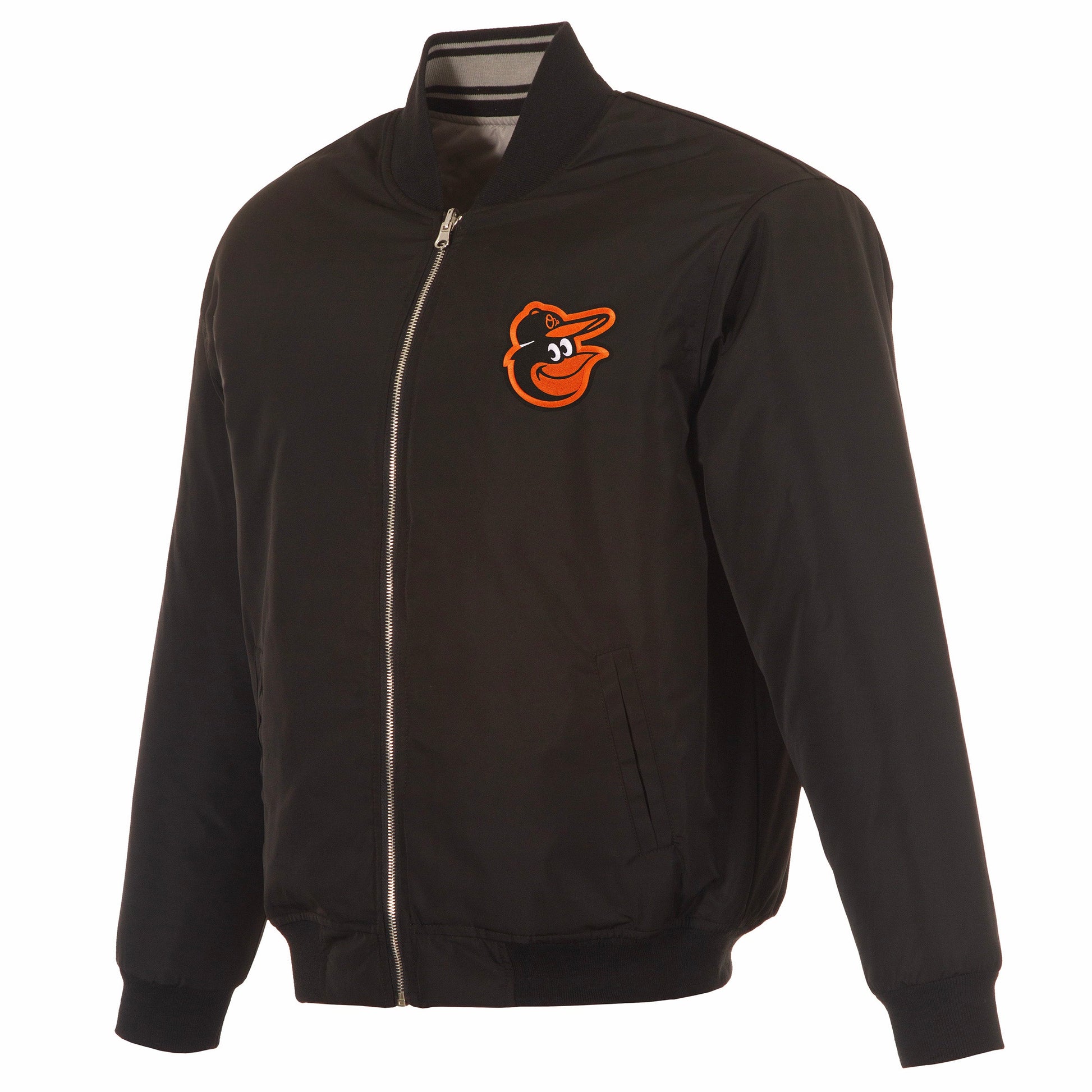 Baltimore Orioles reversible nylon bomber in black and grey with embroidered logos. Assembled in the USA. 100% Nylon, full length zip front.