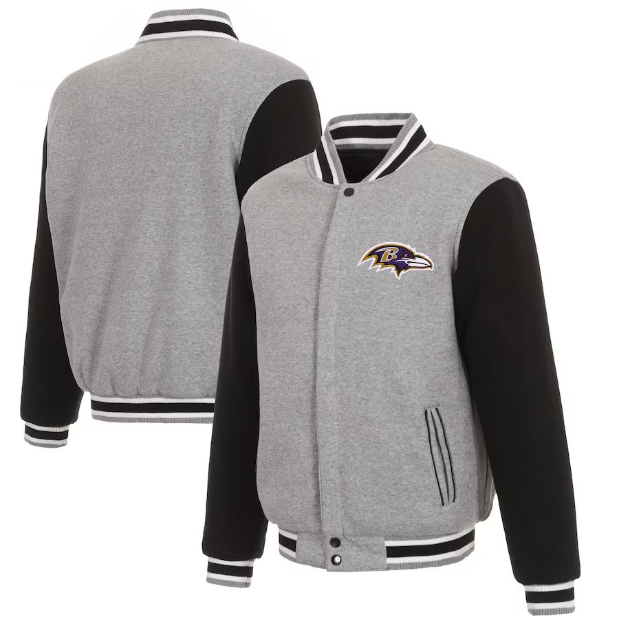 Baltimore Ravens reversible two-tone fleece jacket in grey and black with embroidered logos. Assembled in the USA. 100% polyester body, reverse nylon side, snap button closure.