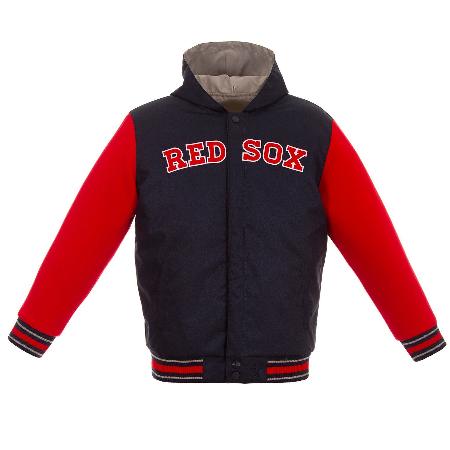 Boston Red Sox kid's reversible poly-twill jacket in navy-red with fleece sleeves and embroidered appliqué logos. Reverse side is nylon.