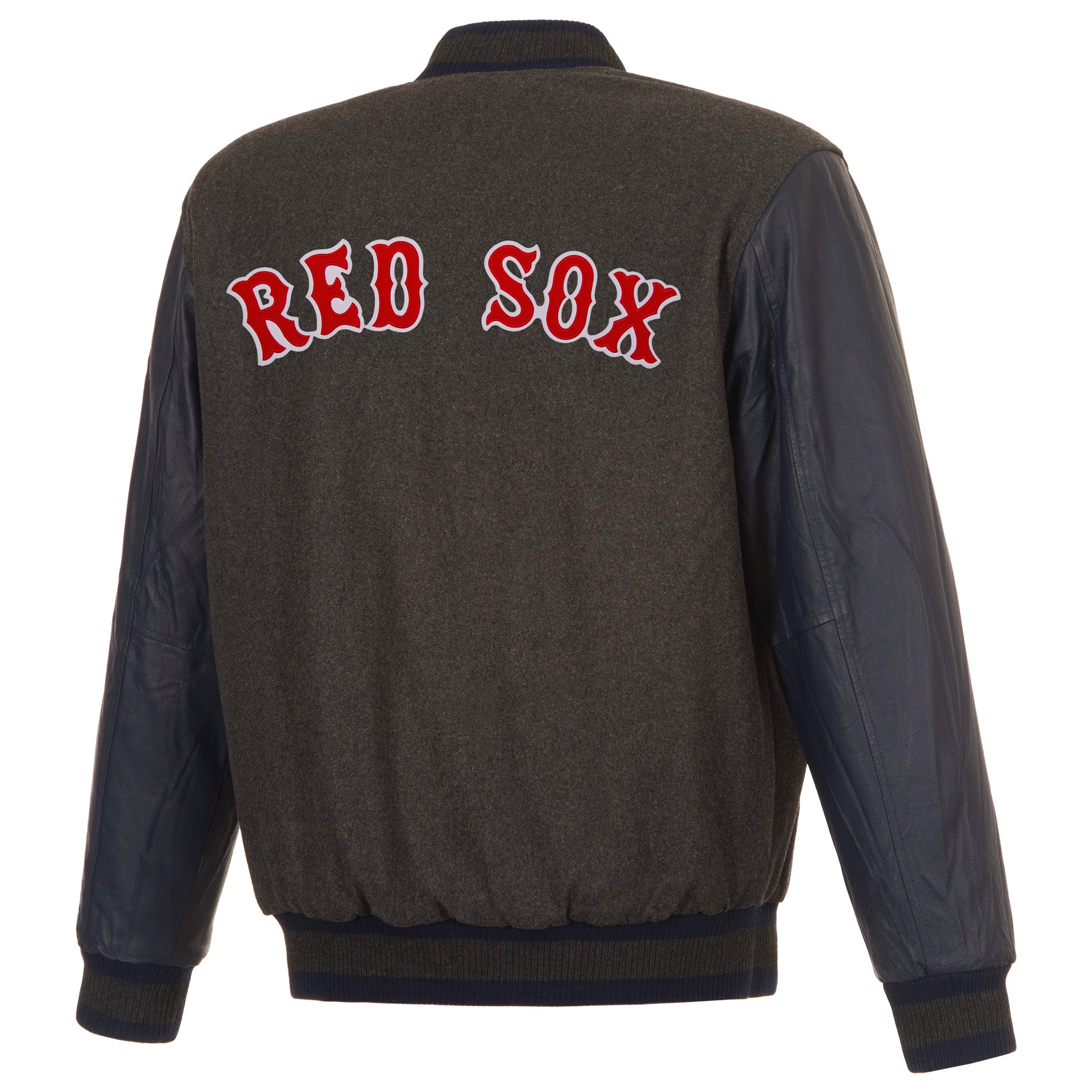 Boston Red Sox reversible wool body and leather sleeves jacket in charcoal and navy with nylon lining and embroidered logos.