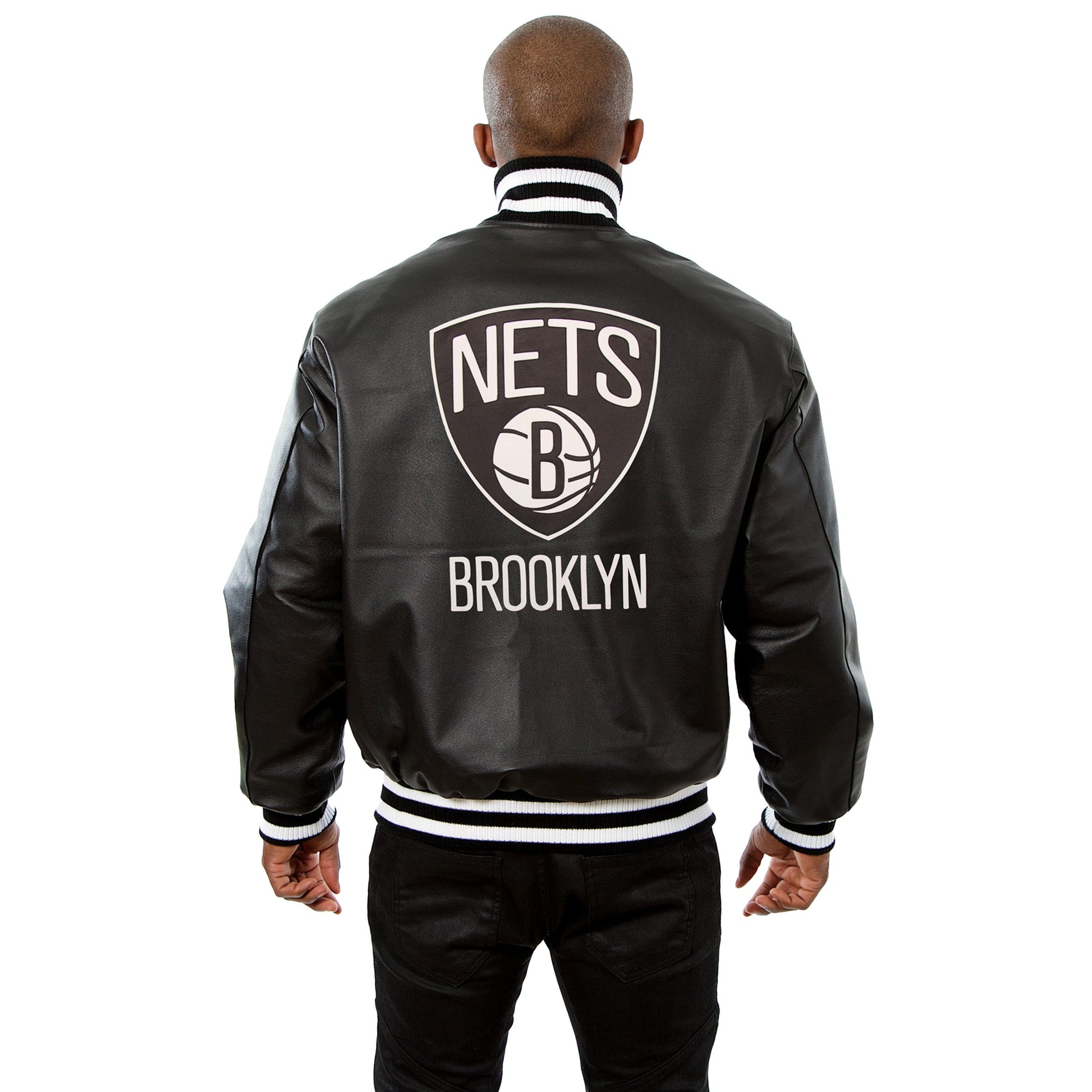 Brooklyn Nets full leather varsity jacket in black. Made in the USA. 100% leather body and sleeves with quilted nylon lining and leather logos, traditional snap front closure.