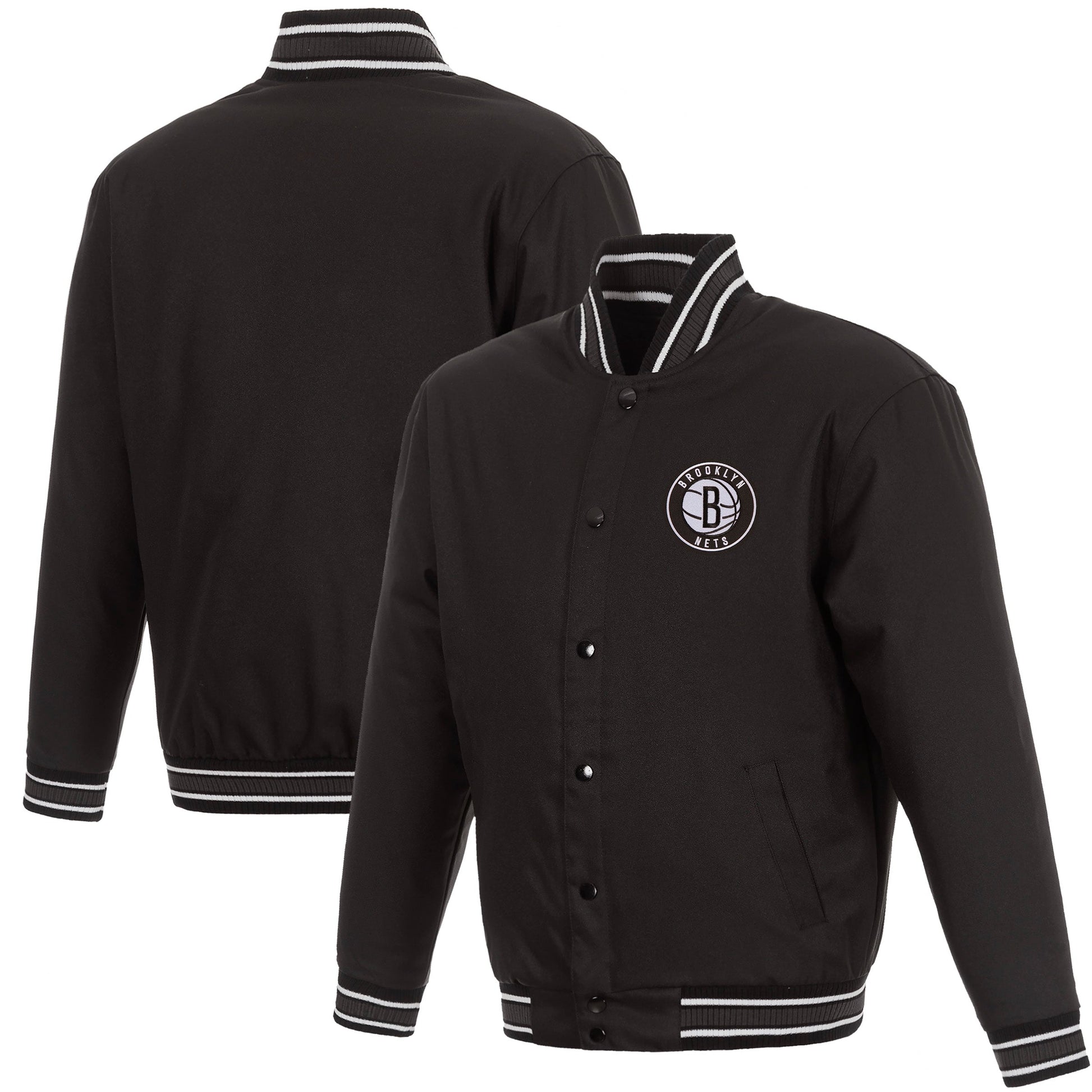 Brooklyn Nets Poly-Twill Jacket with quilted nylon lining in black with embroidered logos. Assembled in the USA. 100% polyester body. Snap button closure.