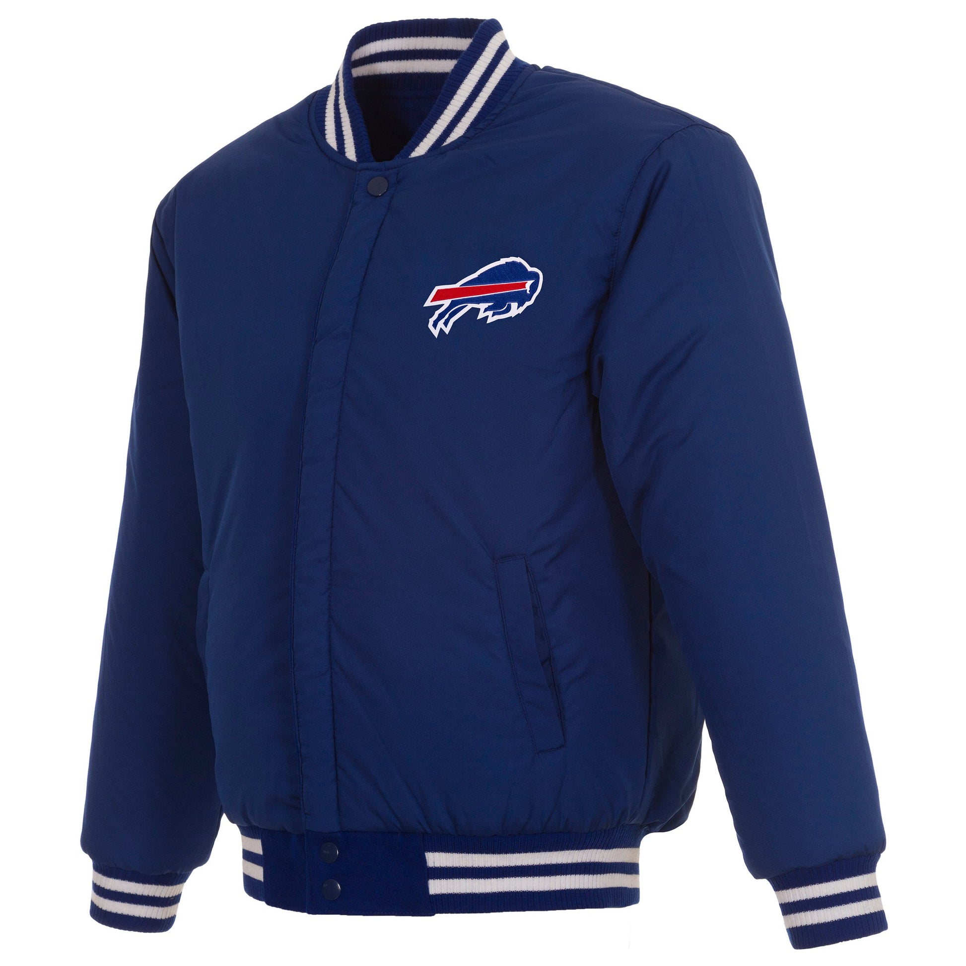 Buffalo Bills All Wool Jacket with nylon lining in royal and white with embroidered logos. Assembled in the USA. 55% wool 45% polyester body. Snap button closure.