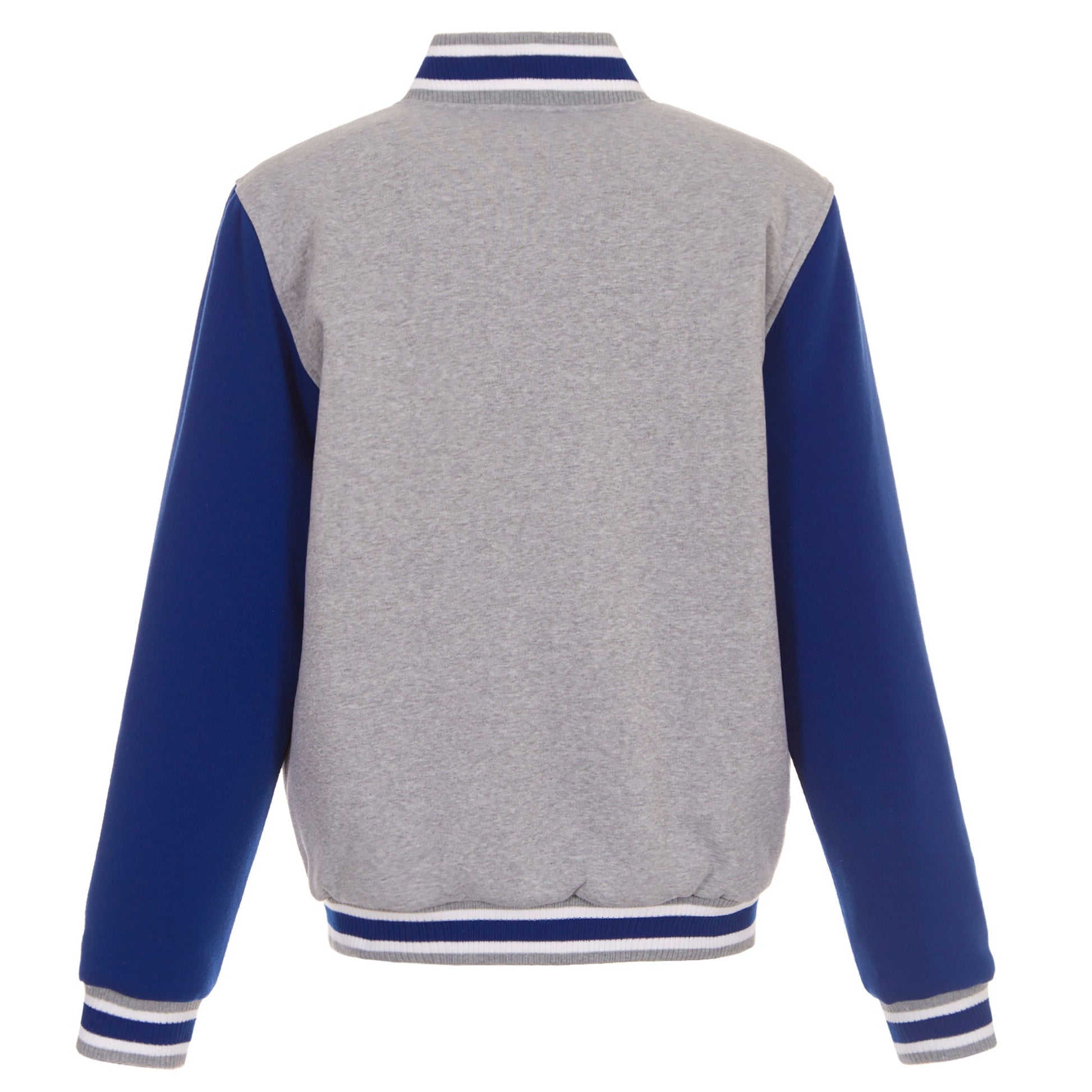 Buffalo Sabres reversible two-tone fleece jacket in grey and royal with embroidered logos. Assembled in the USA. 100% polyester body, reverse nylon side, snap button closure.