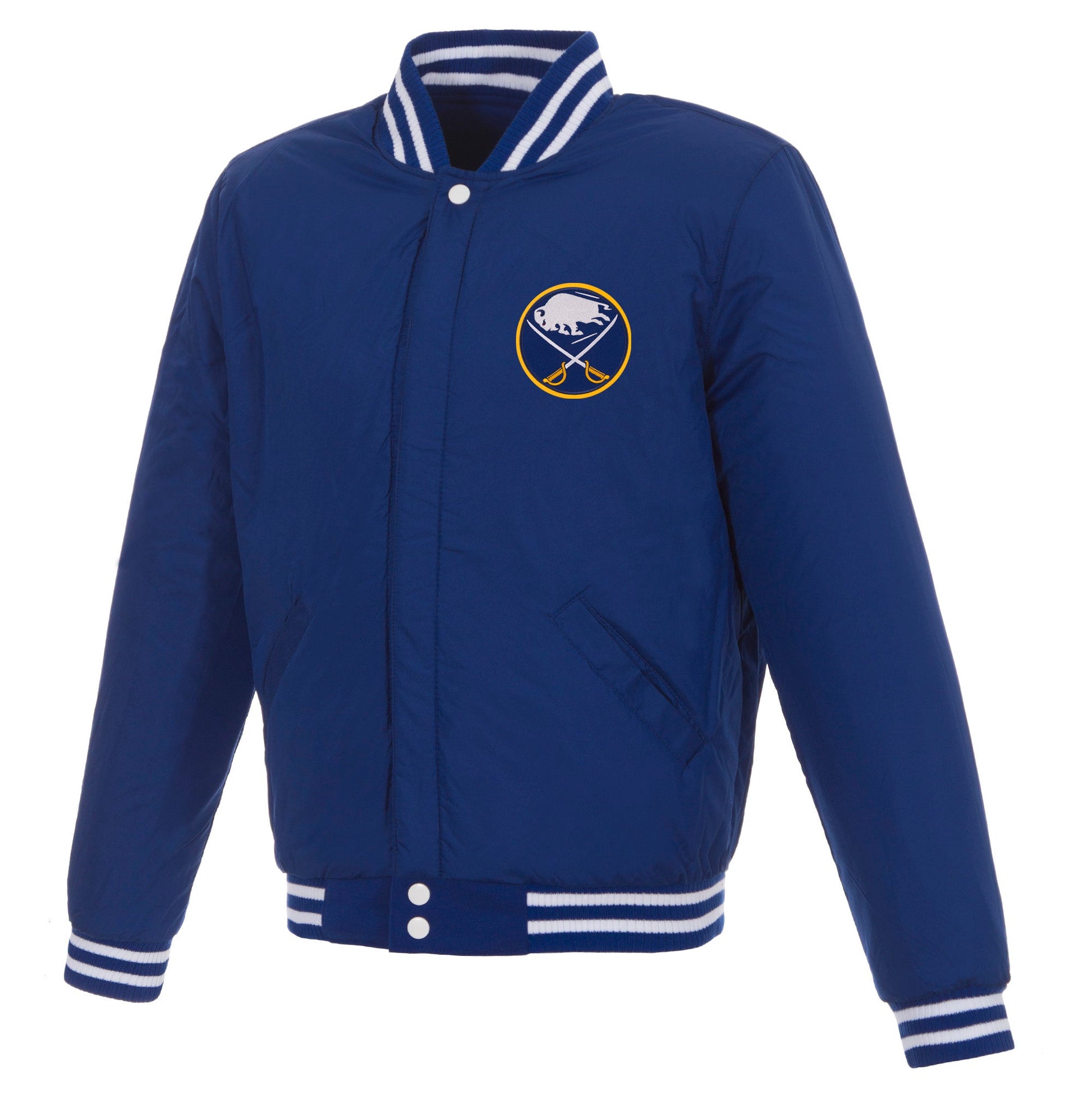 Buffalo Sabres reversible fleece jacket with faux leather sleeves in royal and white with embroidered logos. Assembled in the USA. 100% Polyester body, faux leather sleeves, snap button closure.