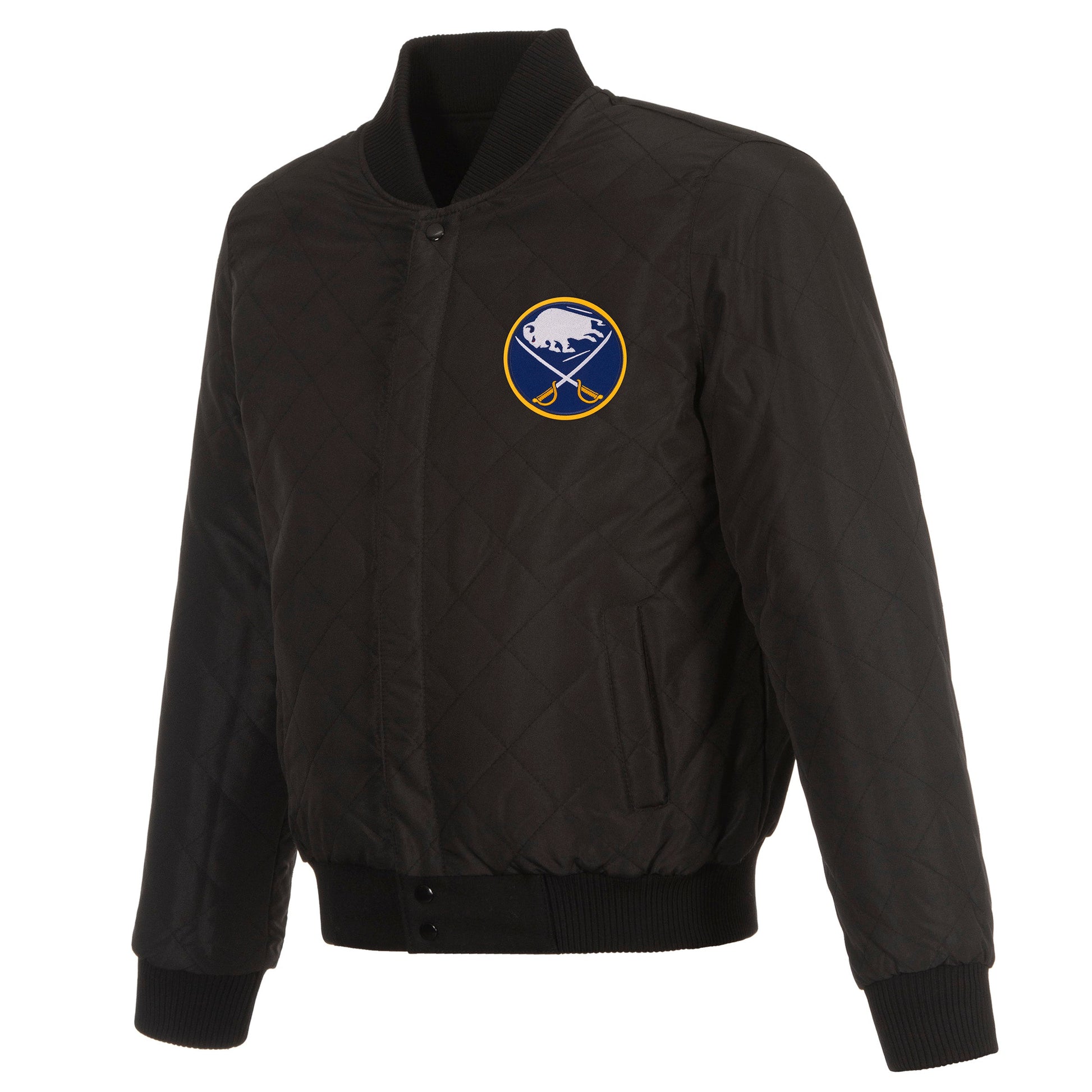Buffalo Sabres reversible wool and leather jacket in charcoal-navy with nylon lining and embroidered appliqué patches. (Front Logos Only)