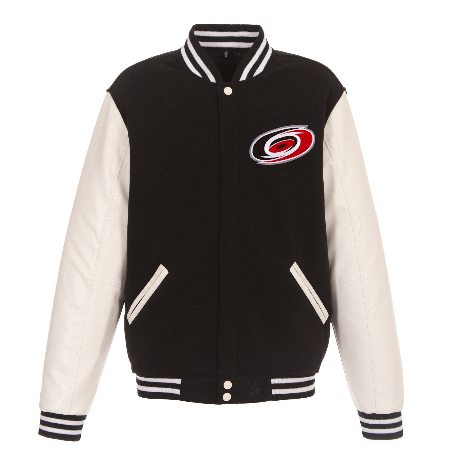 Carolina Hurricanes reversible fleece jacket with faux leather sleeves in black and white with embroidered logos. Assembled in the USA. 100% Polyester body, faux leather sleeves, snap button closure.