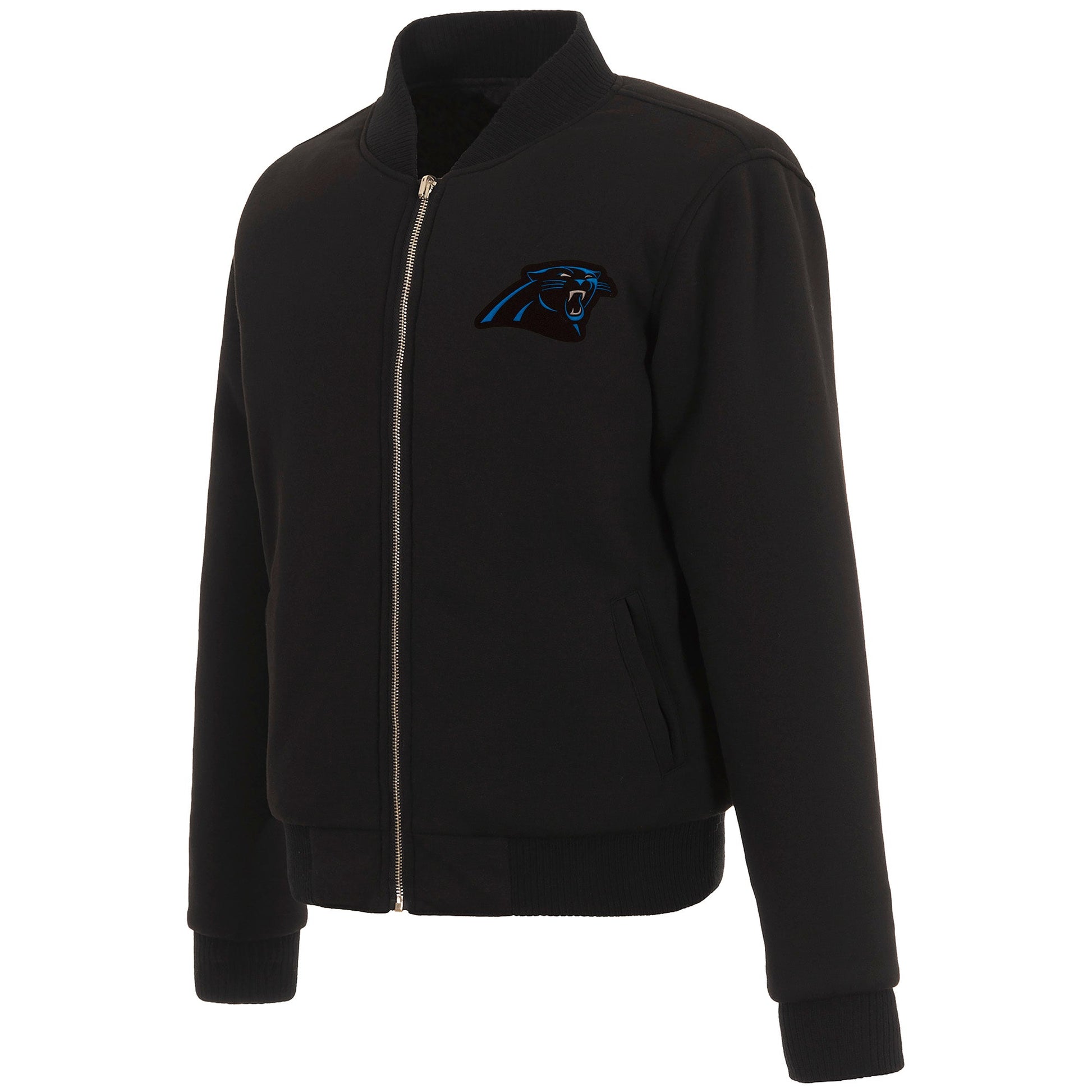 Carolina Panthers Ladies reversible fleece jacket in black with embroidered logos. Assembled in the USA. 100% polyester body, reverse nylon side, metal zip closure.