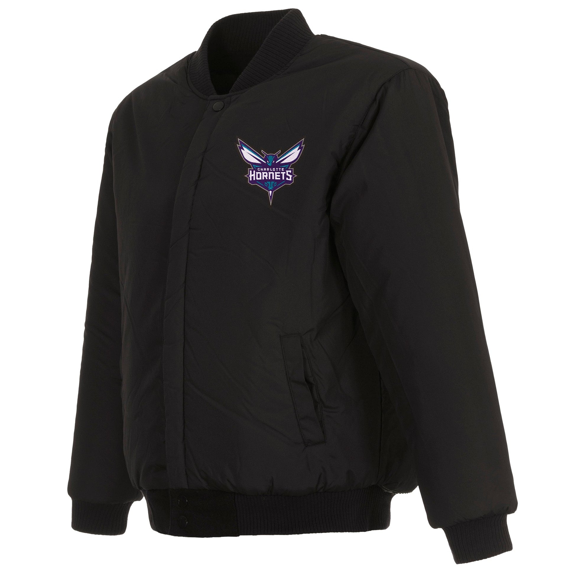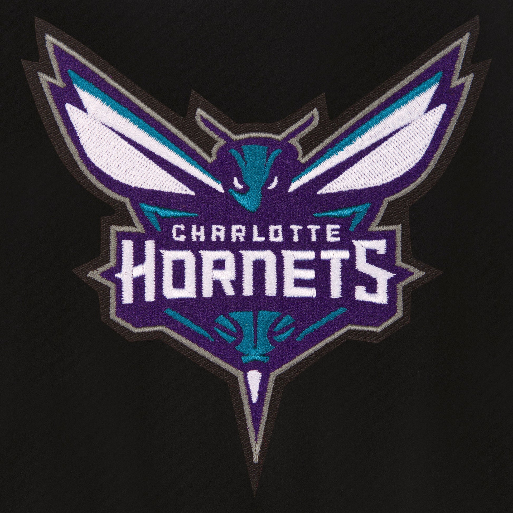 Charlotte Hornets All Wool Jacket with nylon lining in black with embroidered logos. Assembled in the USA. 55% wool 45% polyester body. Snap button closure.