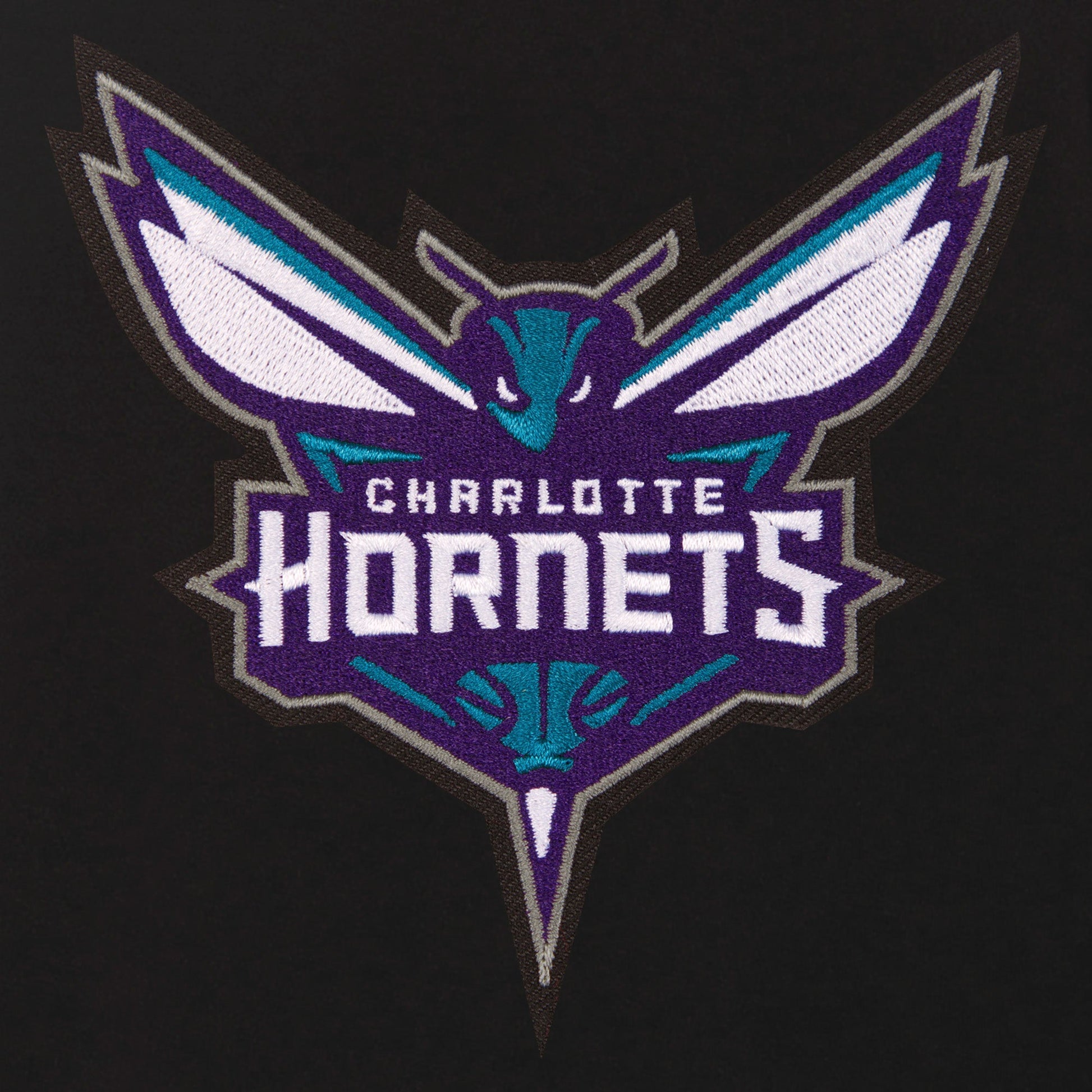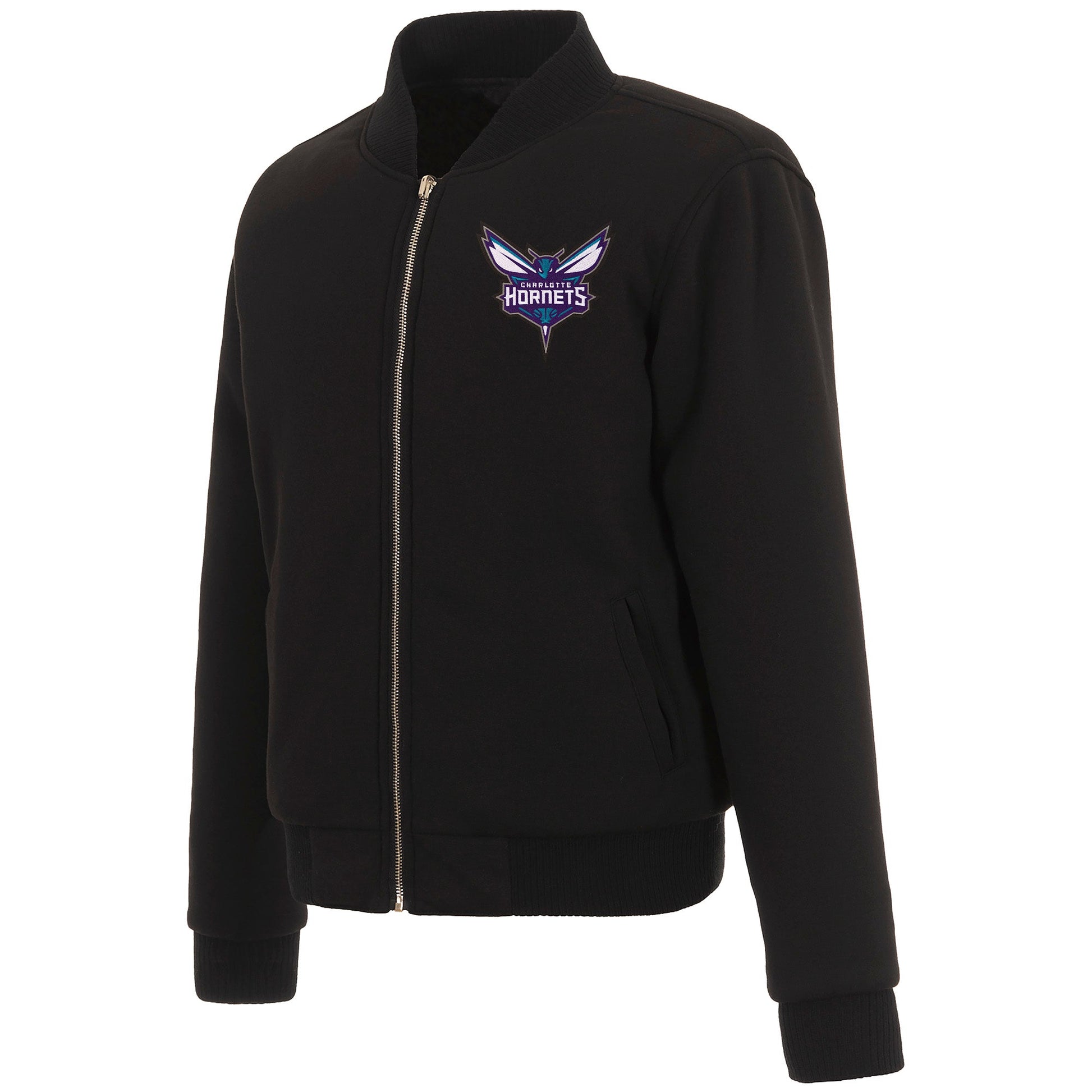 Charlotte Hornets Ladies reversible fleece jacket in black with embroidered logos. Assembled in the USA. 100% polyester body, reverse nylon side, metal zip closure.