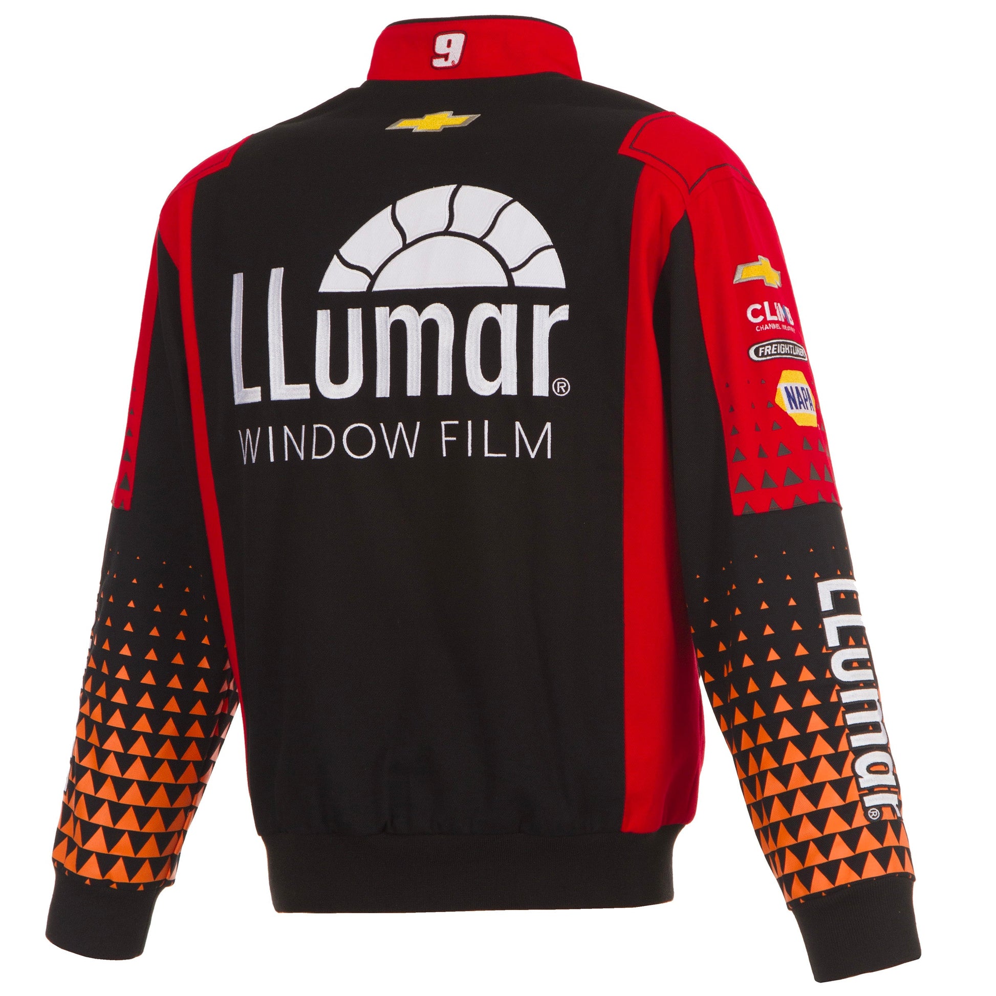 Chase Elliott LLumar Twill Jacket in black and red with embroidered appliqué logos.