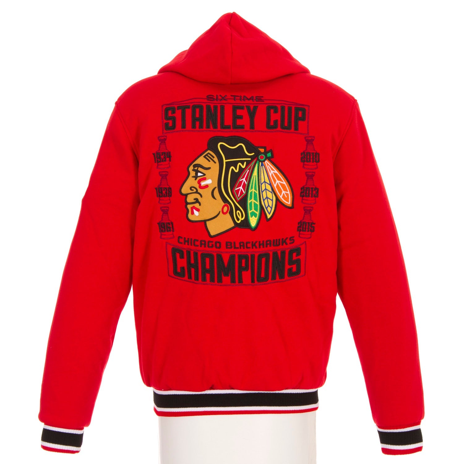 Chicago Blackhawks 2015 championship reversible fleece jacket with hood in red-black with embroidered logos. Reverse side is nylon.