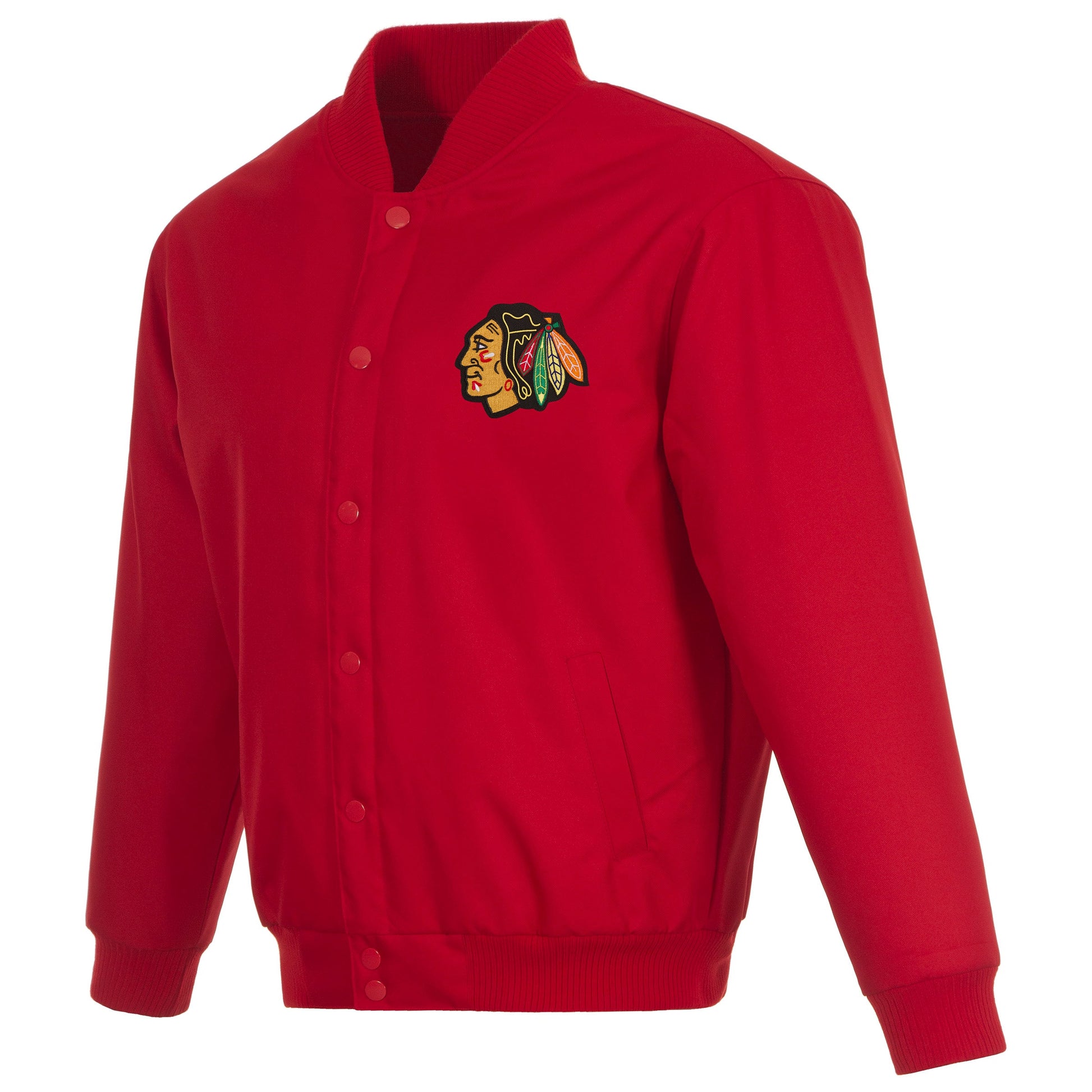 Chicago Blackhawks Poly-Twill Jacket with quilted nylon lining in red with embroidered logos. Assembled in the USA. 100% polyester body, snap button closure.