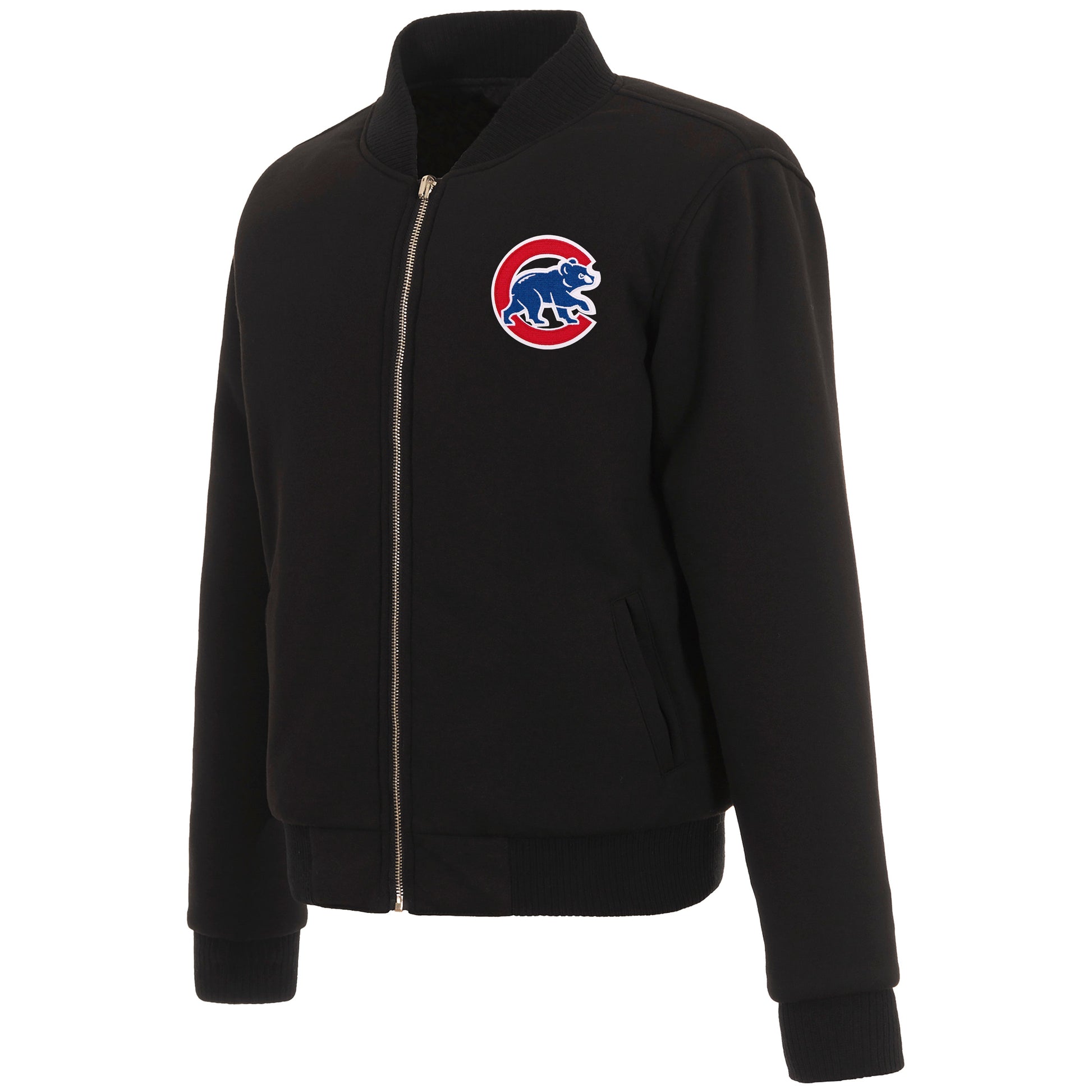 Chicago Cubs Ladies reversible fleece jacket in black with embroidered logos. Assembled in the USA. 100% polyester body, reverse nylon side, metal zip closure.