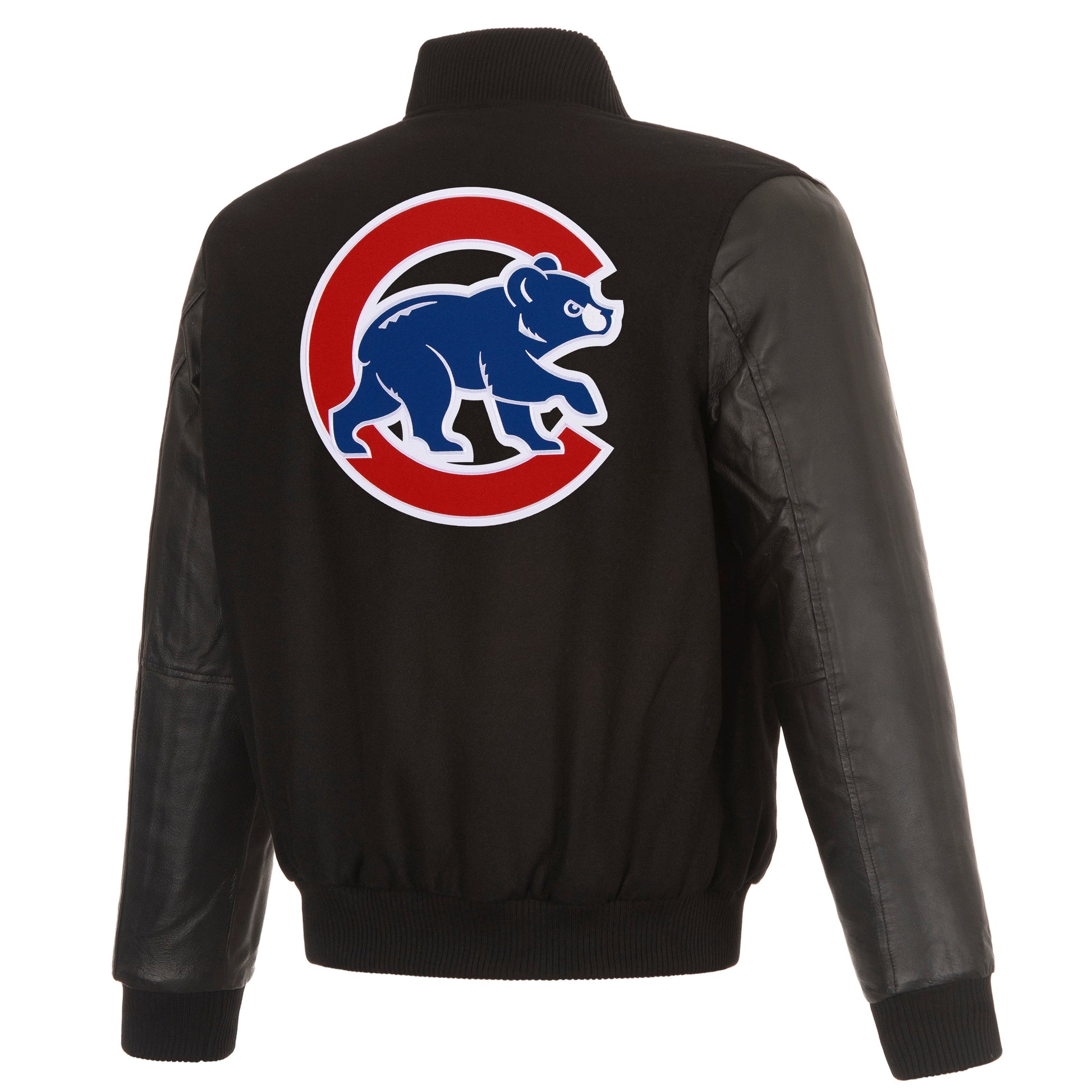 Chicago Cubs reversible wool body and leather sleeves jacket in black with quilted lining and embroidered appliqué logos.