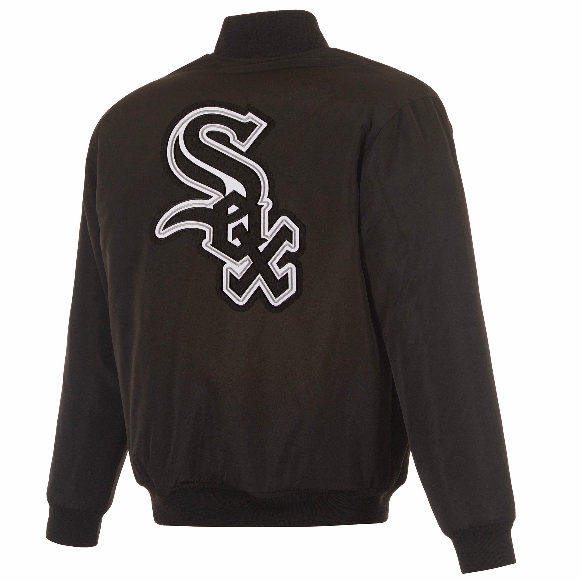 Chicago White Sox Reversible nylon bomber in black and grey with embroidered logos. Assembled in the USA. 100% Nylon, full length zip front.