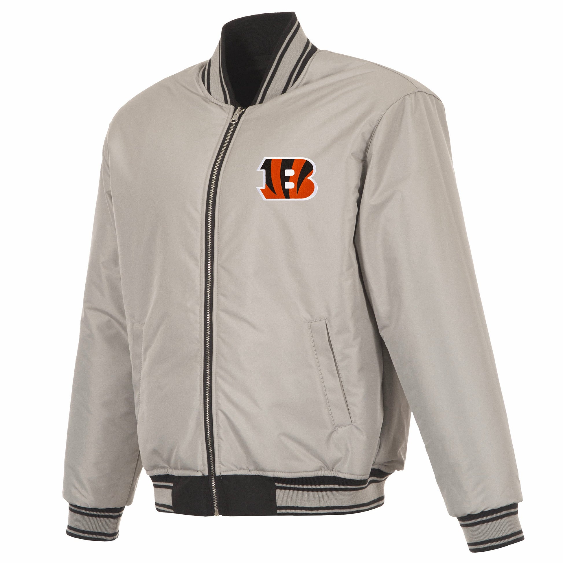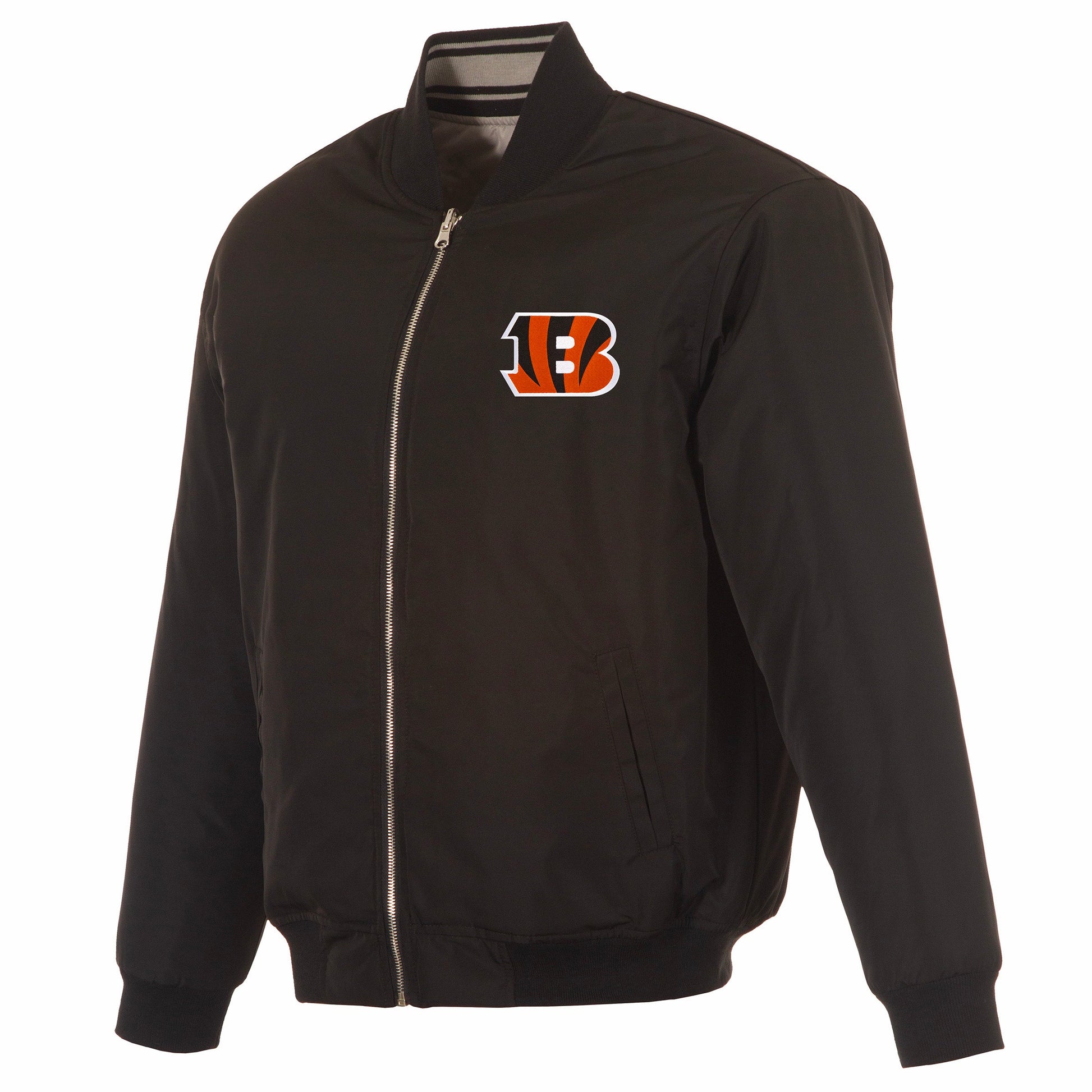 Cincinnati Bengals reversible nylon bomber in black and grey with embroidered logos. Assembled in the USA. 100% Nylon, full length zip front.