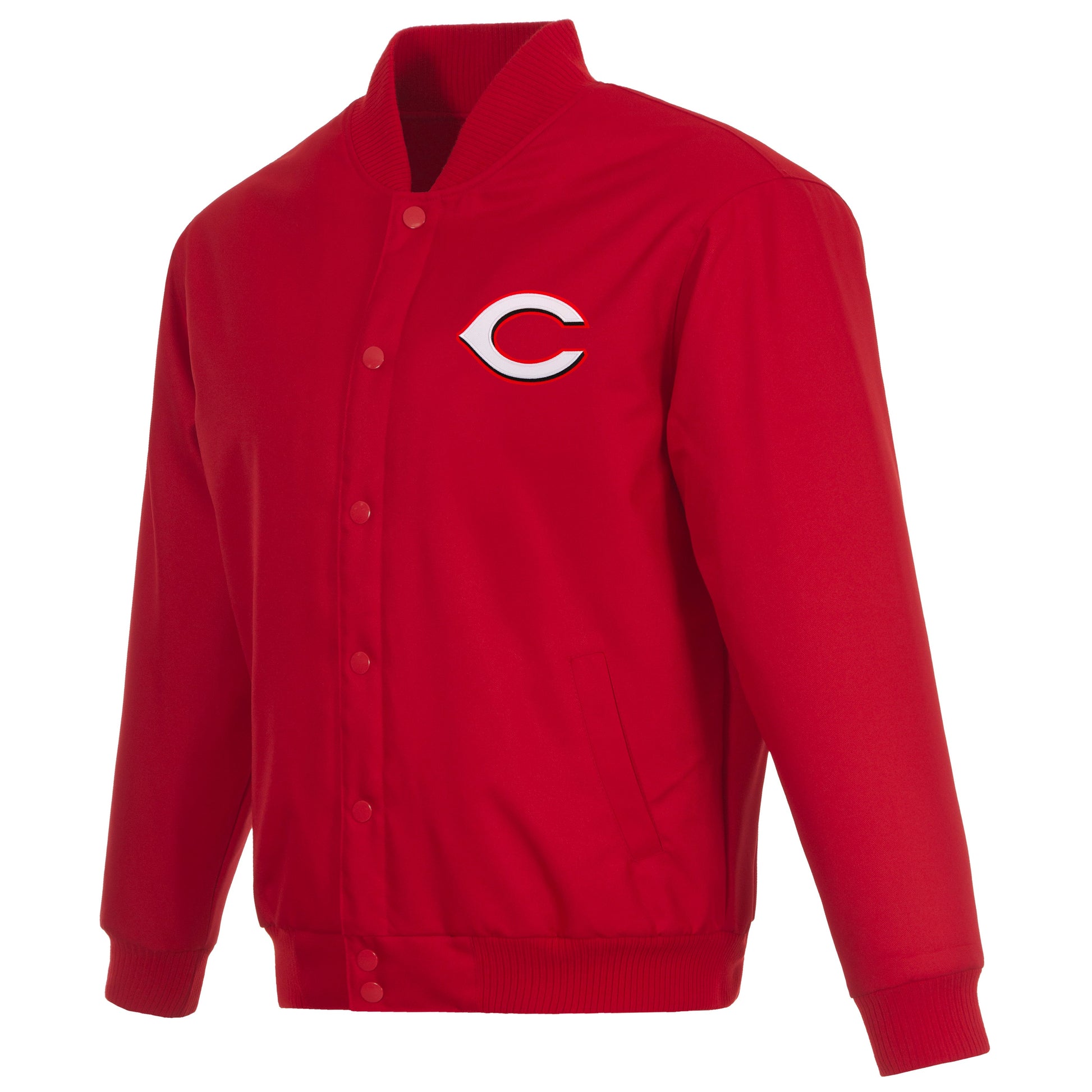 Cincinnati Reds Poly-Twill Jacket with quilted nylon lining in red with embroidered logos. Assembled in the USA. 100% Polyester body, snap button closure.