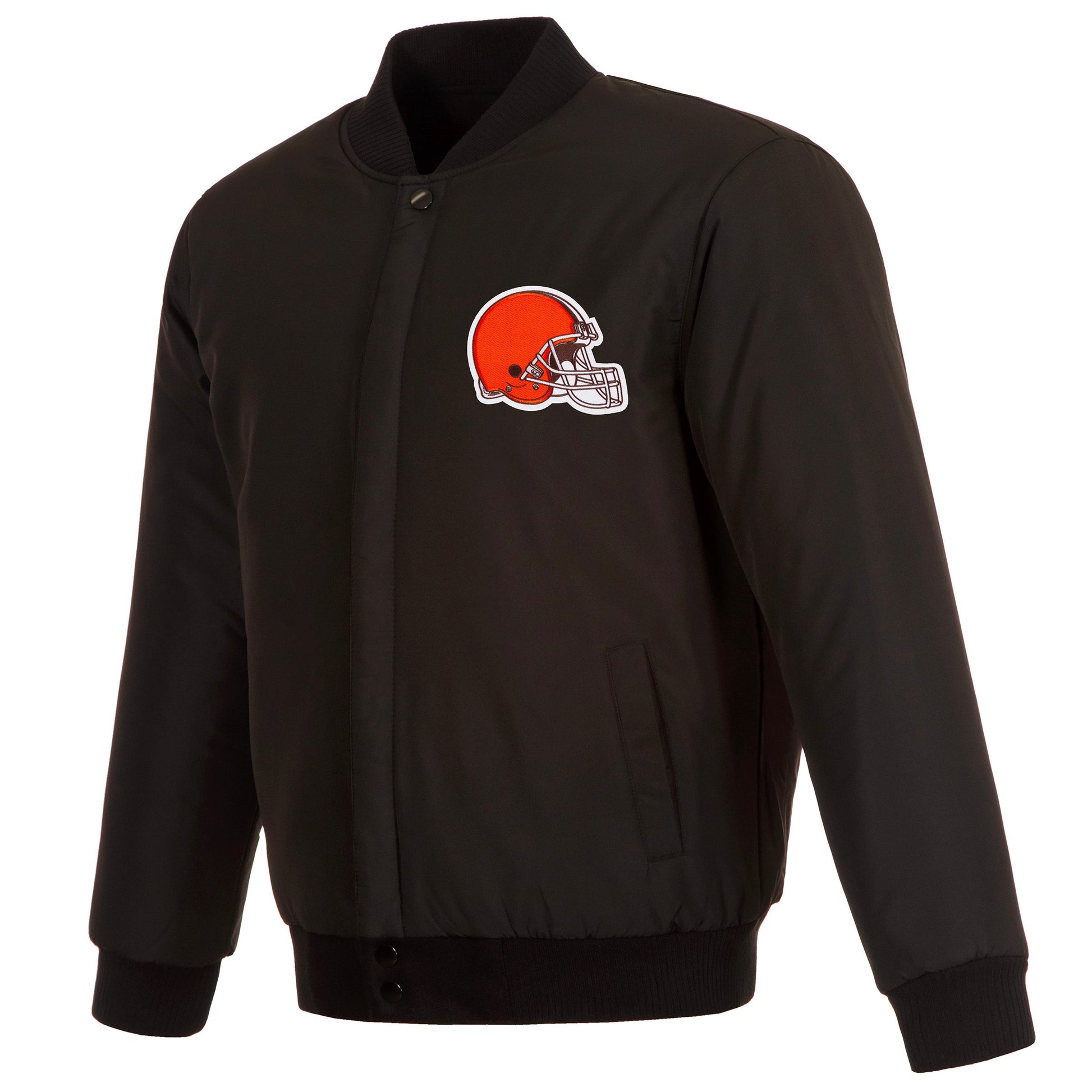 Cleveland Browns All Wool Jacket with nylon lining in black with embroidered logos. Assembled in the USA. 55% wool 45% polyester body. Snap button closure.