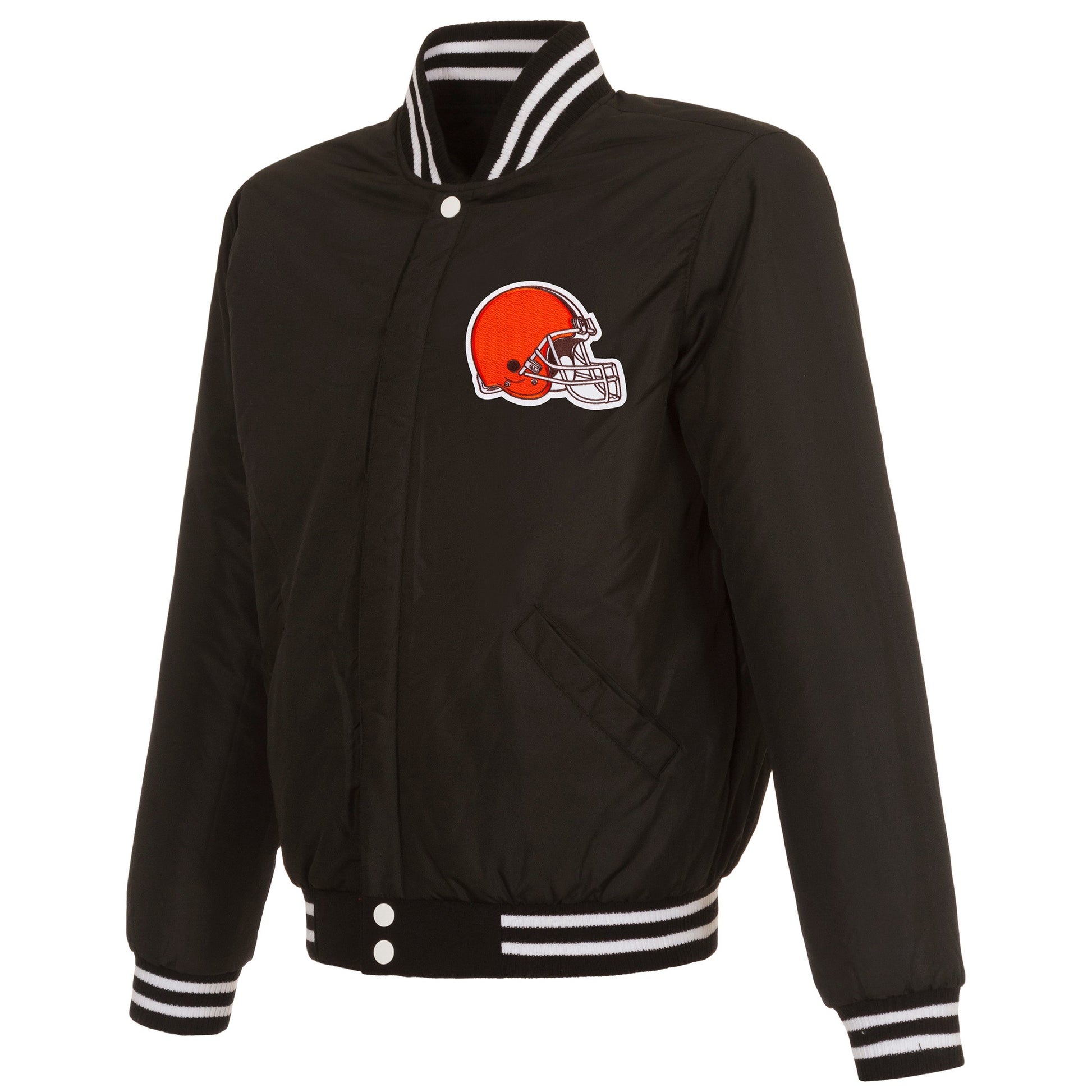 Cleveland Browns reversible fleece jacket with faux leather sleeves in black and white with embroidered logos. Assembled in the USA. 100% polyester body, faux leather sleeves, snap button closure.