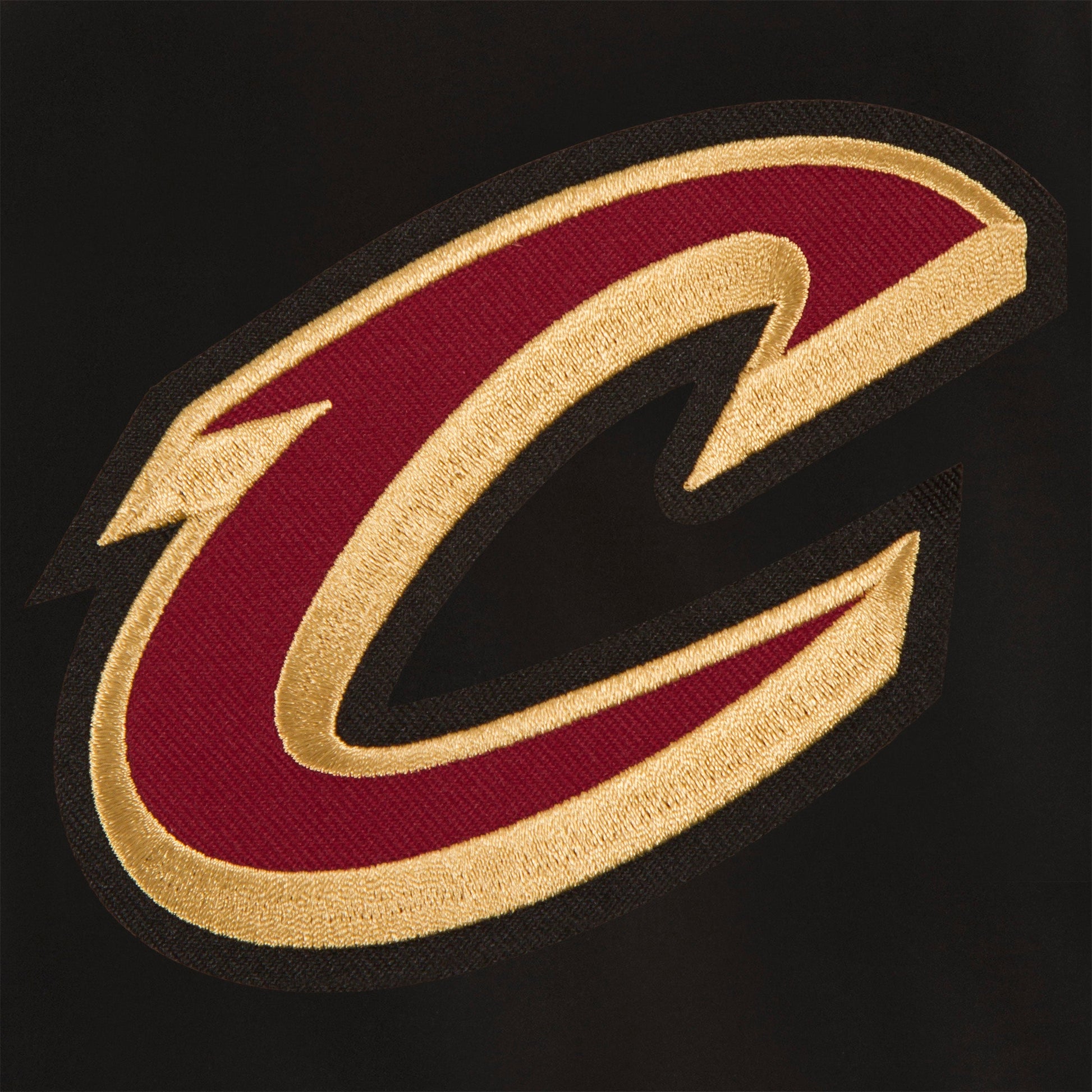 Cleveland Cavaliers All Wool Jacket with nylon lining in black with embroidered logos. Assembled in the USA. 55% wool 45% polyester body. Snap button closure.