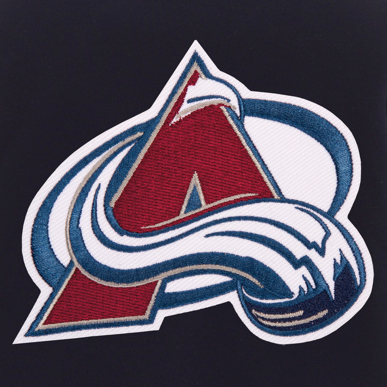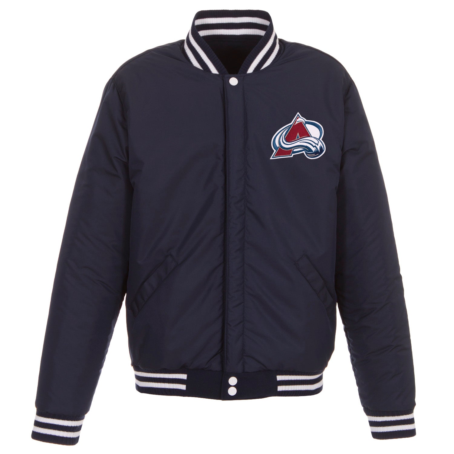 Colorado Avalanche reversible fleece jacket with faux leather sleeves in navy and white with embroidered logos. Assembled in the USA. 100% Polyester body, faux leather sleeves, snap button closure.