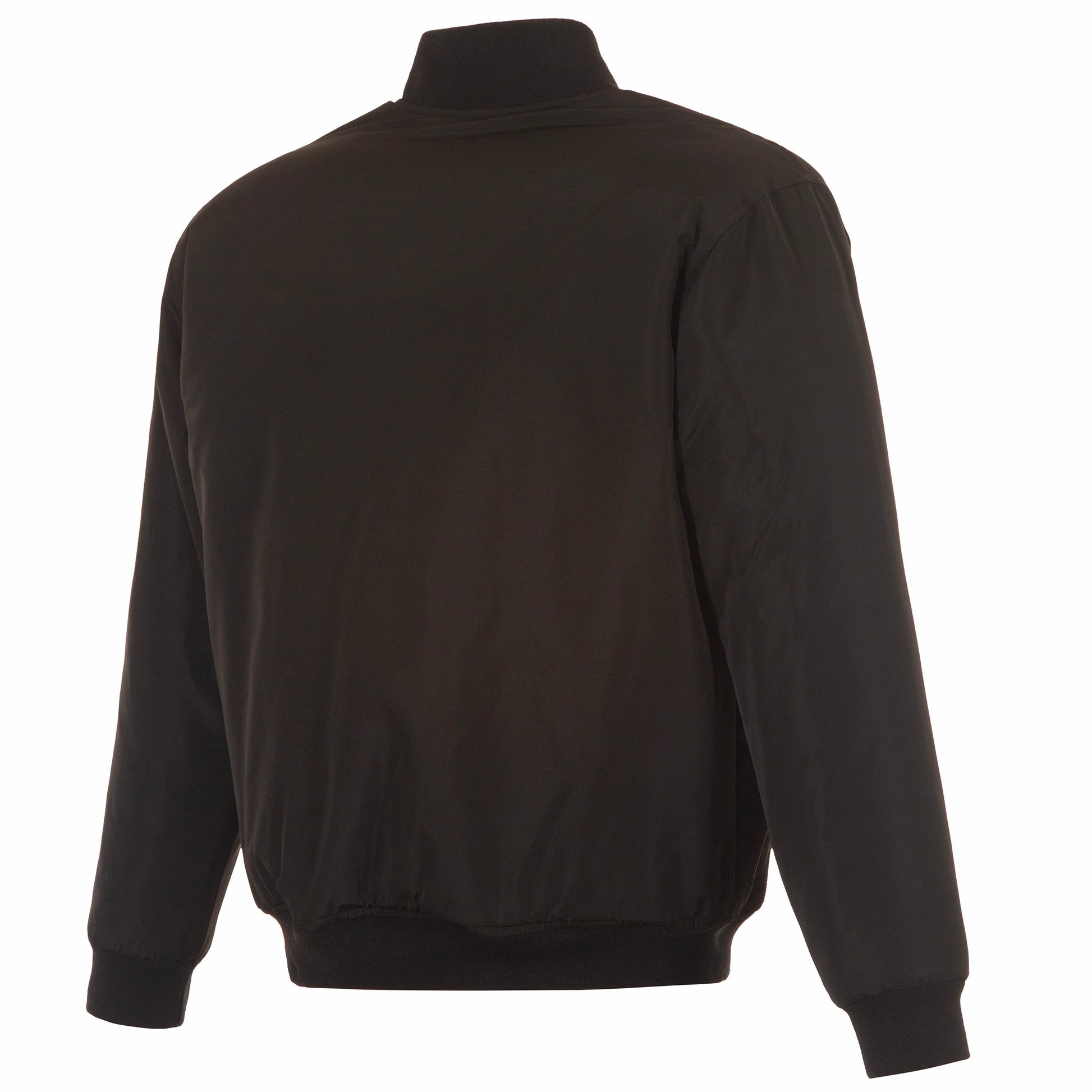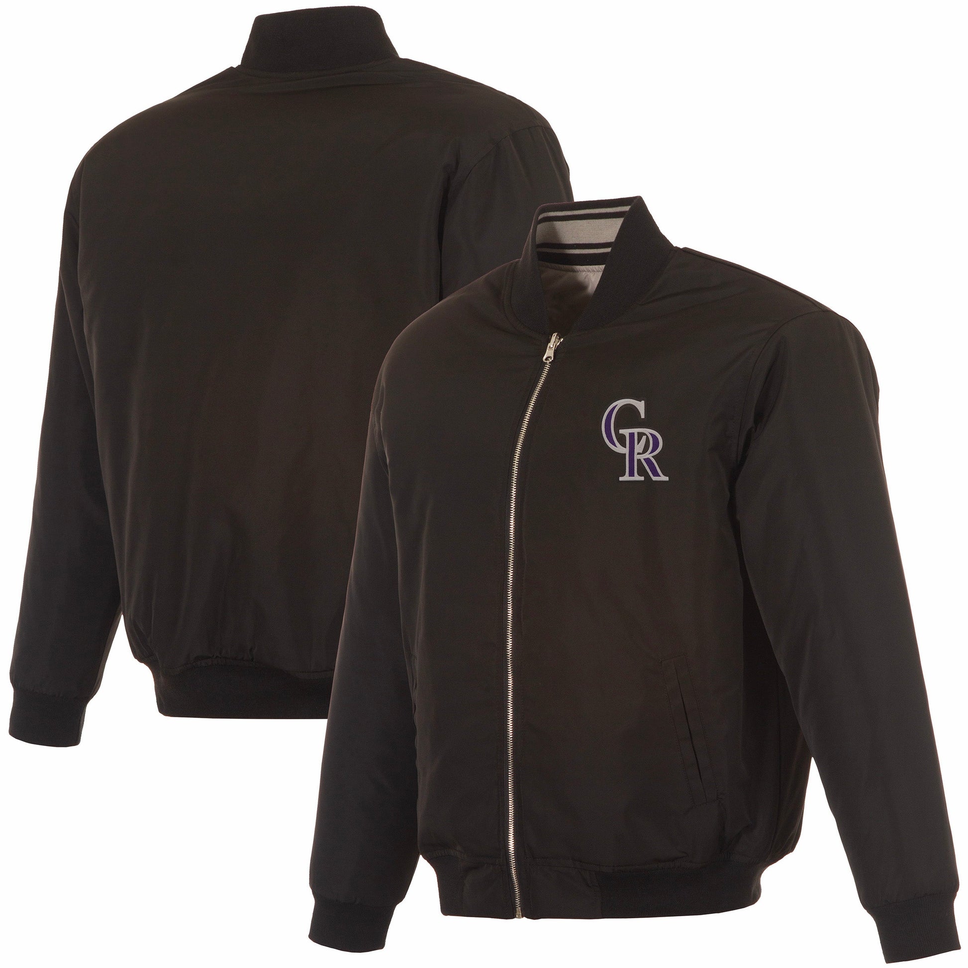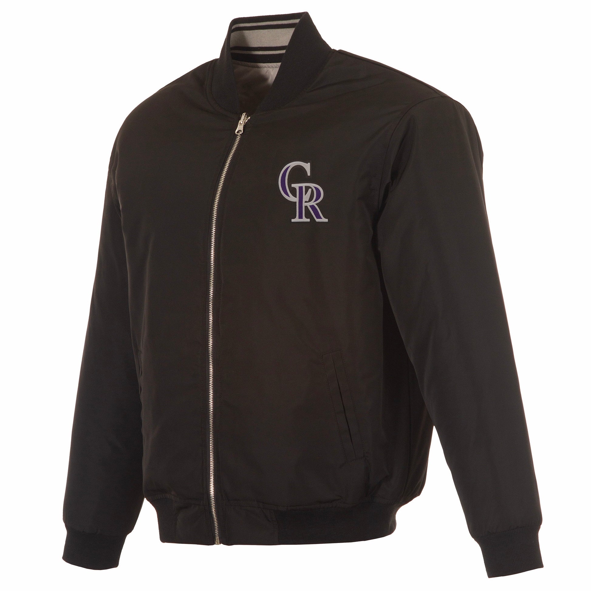 Colorado Rockies Reversible nylon bomber in black and grey with embroidered logos. Assembled in the USA. 100% Nylon, full length zip front.