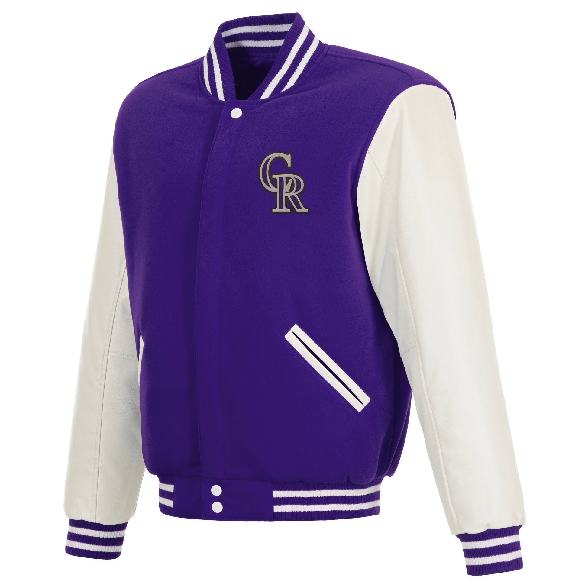 Colorado Rockies Reversible Varsity Jacket with faux leather sleeves in purple and white with embroidered logos. Assembled in the USA. 100% Polyester body, faux leather sleeves, snap button closure.