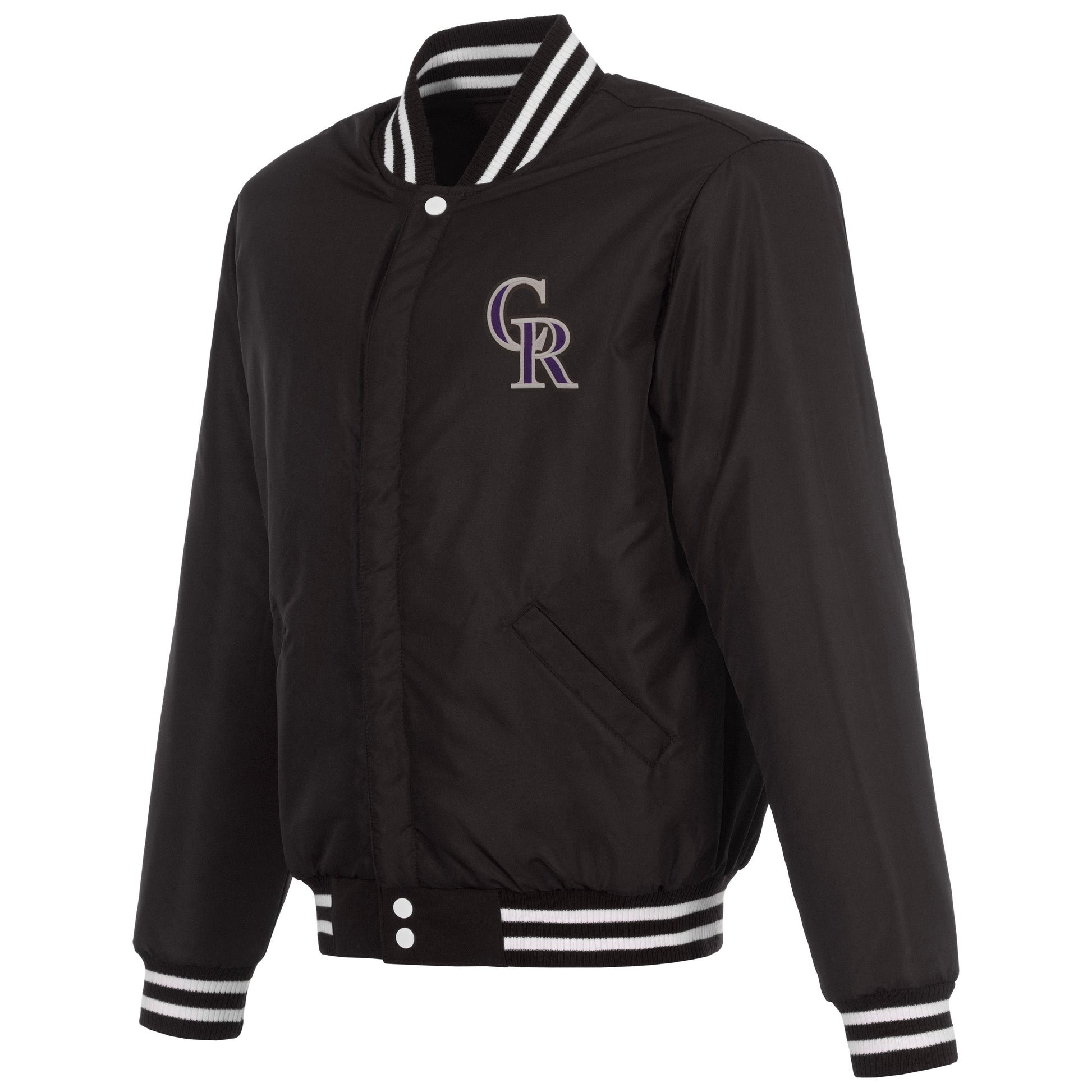 Colorado Rockies reversible fleece jacket with Faux Leather sleeves in black and white with nylon lining and embroidered logos.