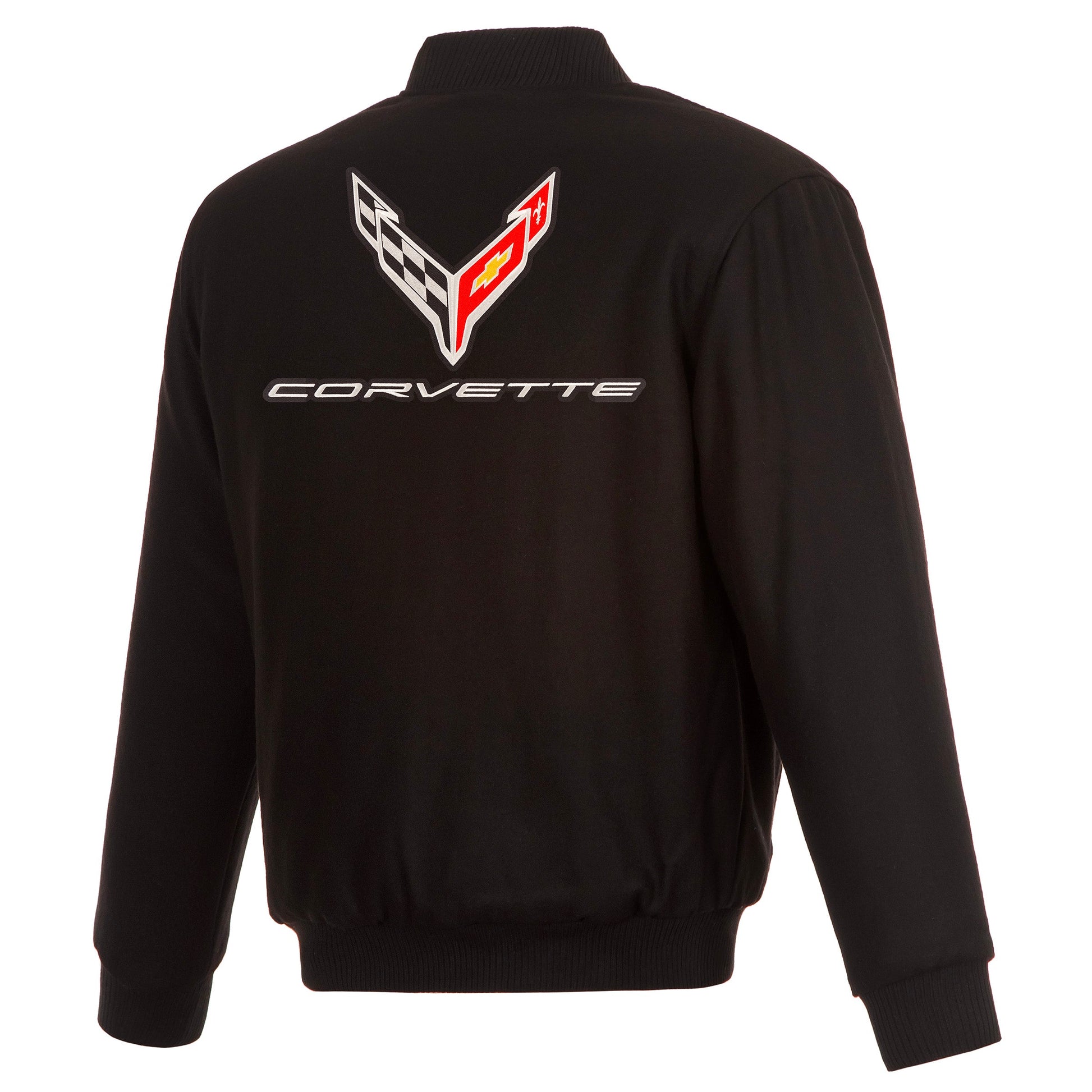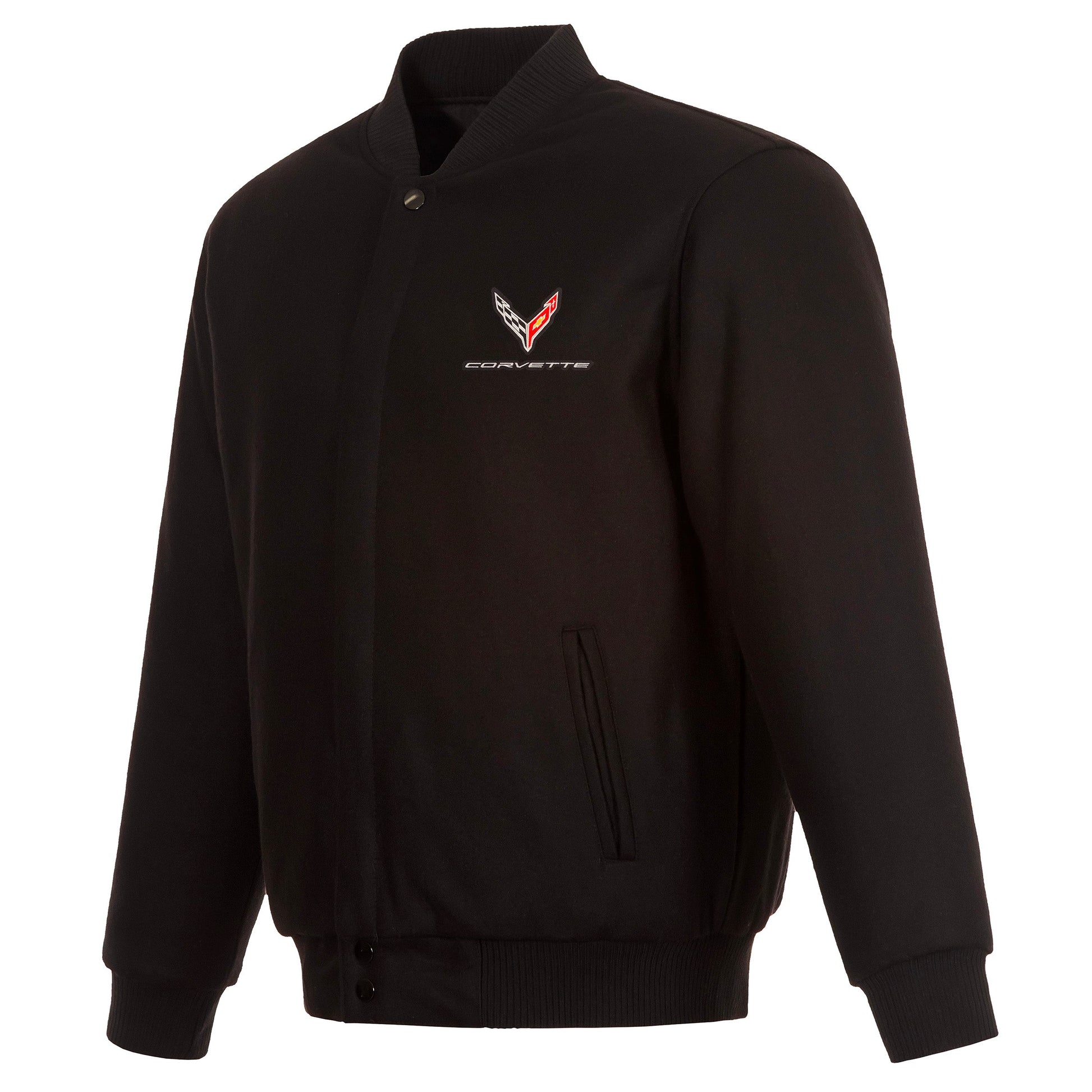 Corvette C8 Reversible All Wool Jacket with nylon lining in black with embroidered logos. Assembled in the USA. 55% wool 45% polyester body. Snap button closure.