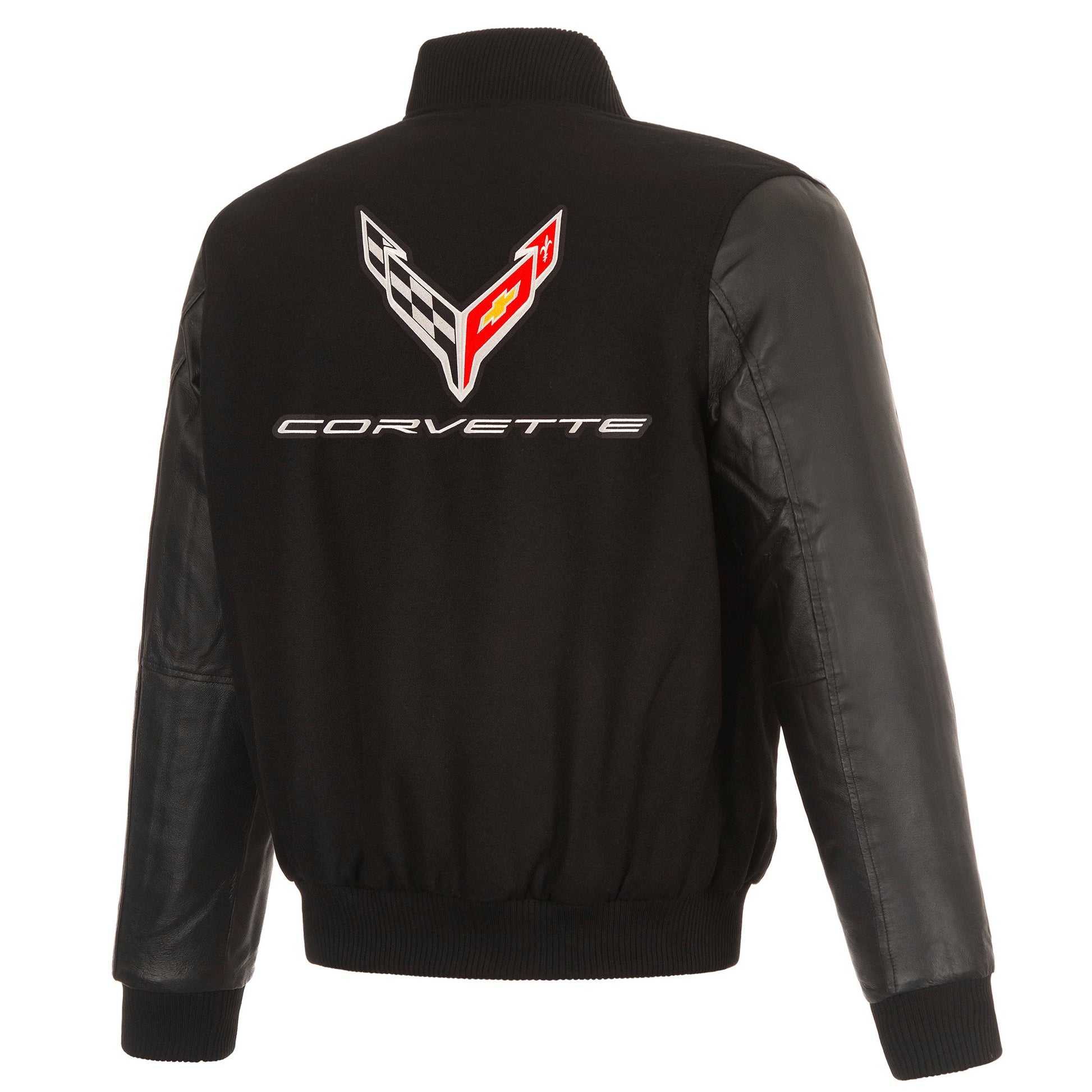 Corvette C8 Reversible Wool and Leather Jacket in black with quilted lining and embroidered appliqué logos.